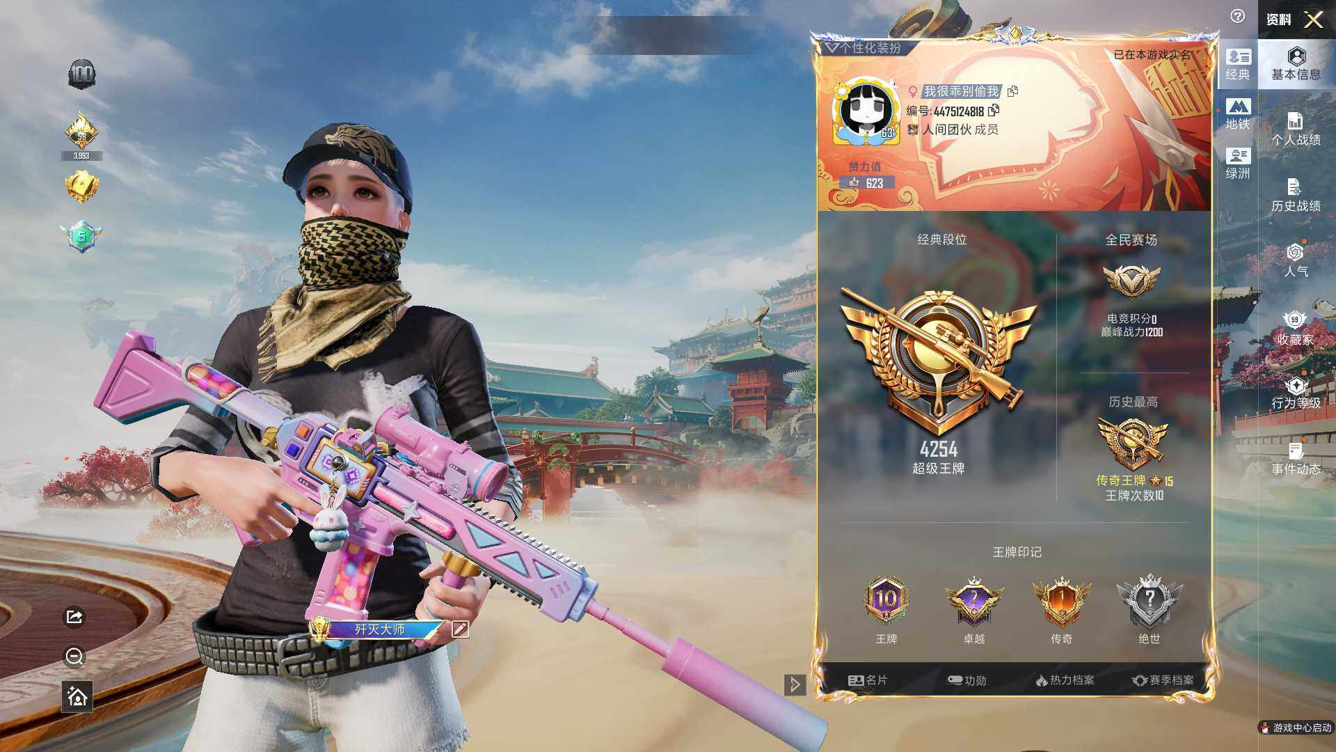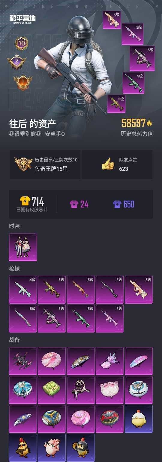 【秒换绑】安卓 手Q-1粉装-9特效枪-0载具-3粉色飞行器-58597热力值-10王牌印记-150套装-206枪皮