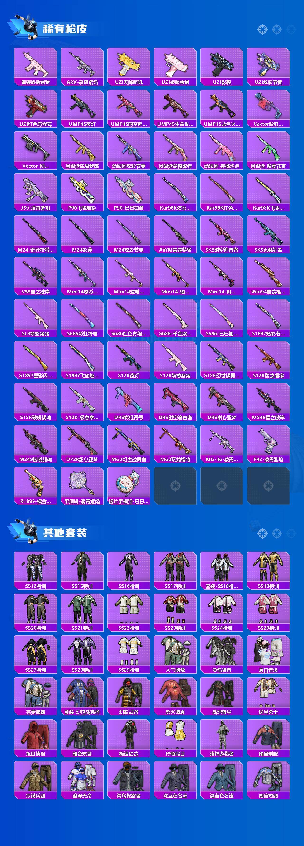 【粉色枪皮等级】:M416-电玩时刻(五级),GROZA-镜光银凌(五级),AUG-暖羊咩咩(五级),M762-青锋波束(五级),AKS-74U-森灵之息(五级),Kar98K-巳巳如意