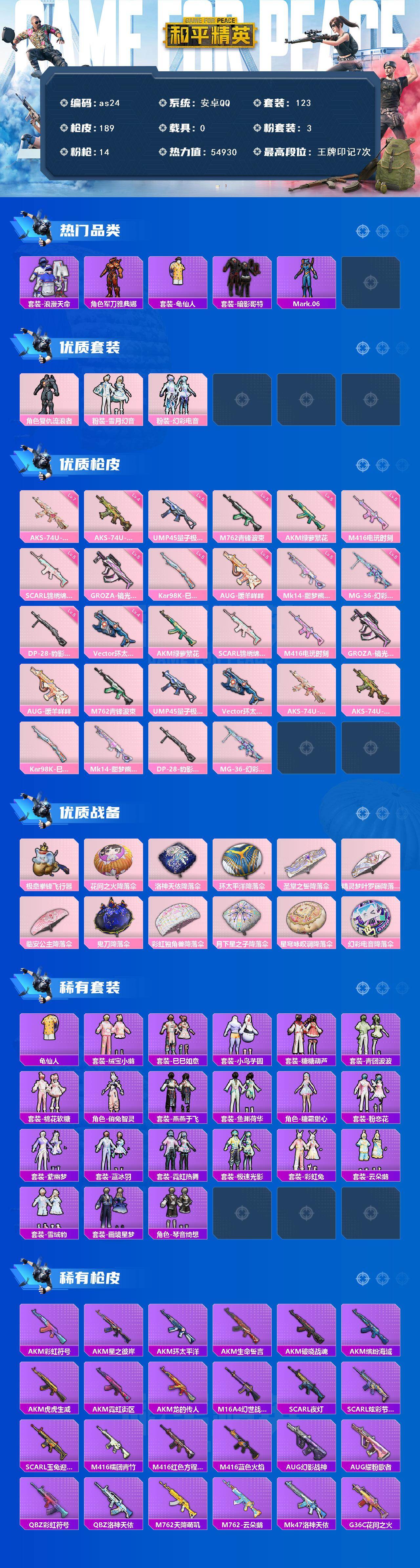 安卓 手Q-3粉装-14特效枪-0载具-3粉色飞行器-54930热力值-7王牌印记-123套装-189枪皮