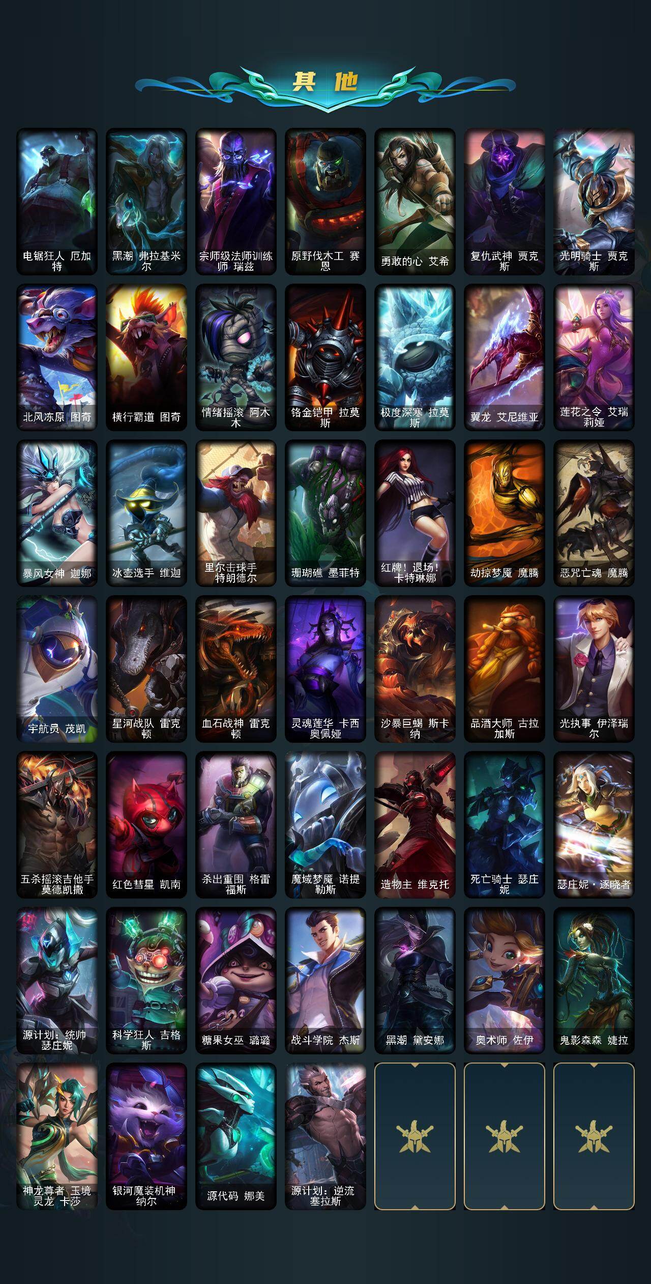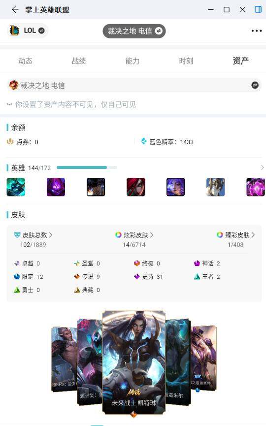 未定级段位-144英雄-102皮肤-14炫彩-0终极-2神话-12限定-9传说-31史诗