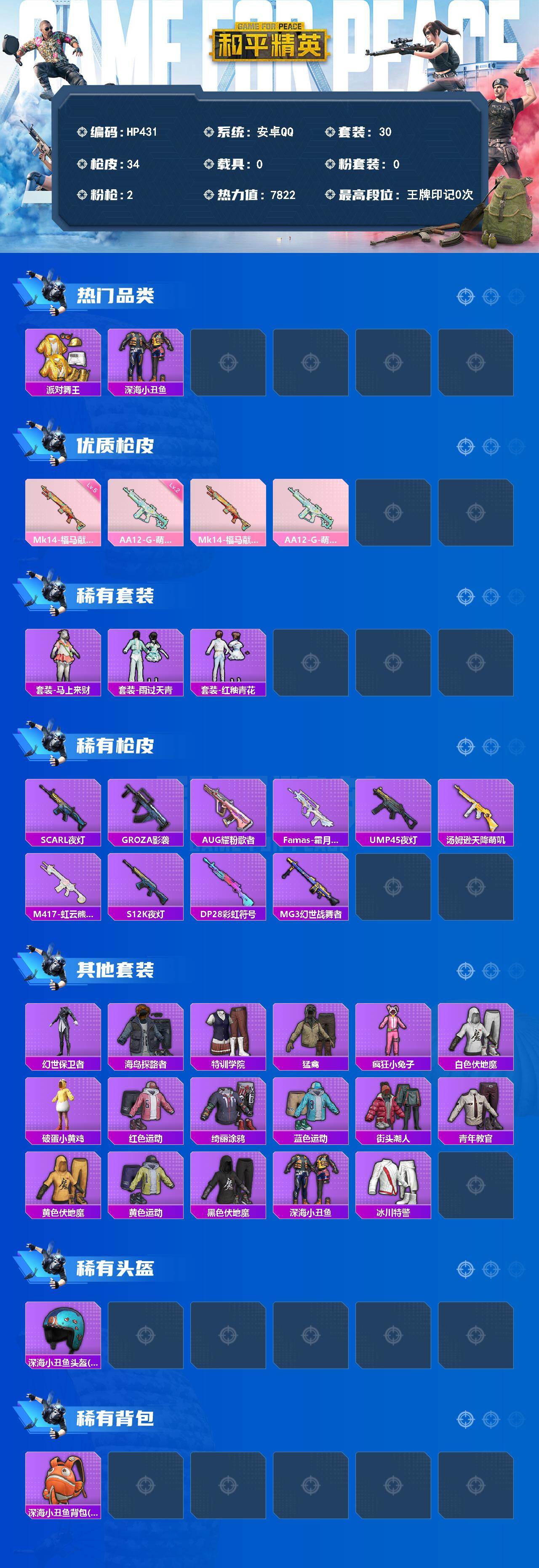 【秒换绑】安卓 手Q-0粉装-2特效枪-0载具-0粉色飞行器-7822热力值-1王牌印记-30套装-34枪皮