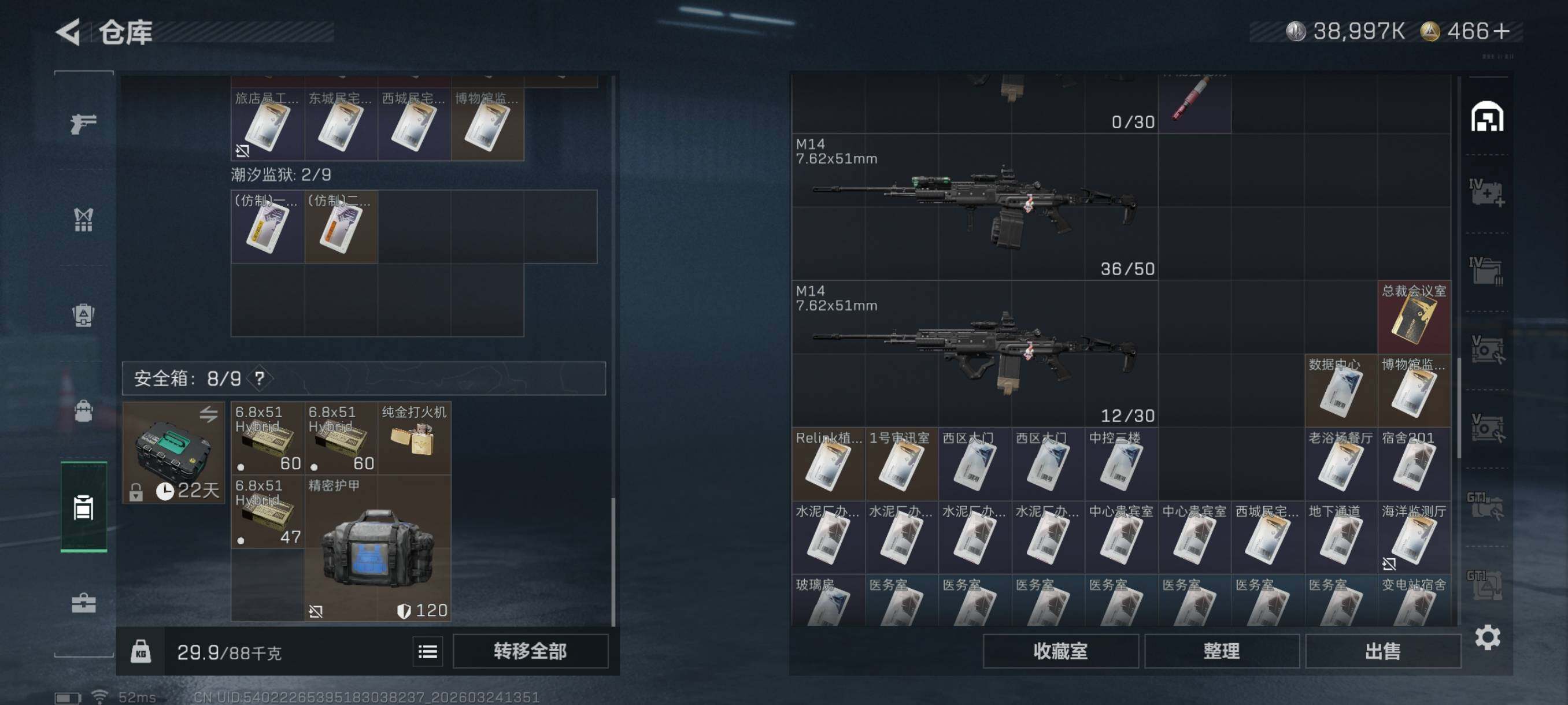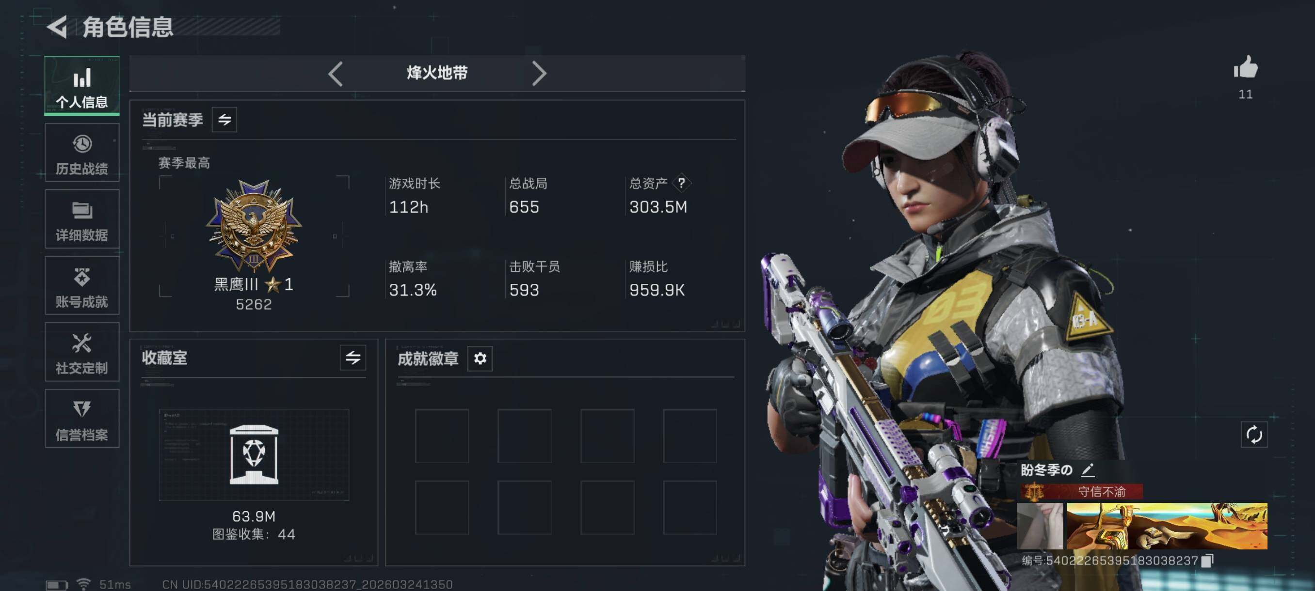 {特价出售}等级:60 总资产:303.5M 纯币38997k : 红皮:凌霄戍卫 刀皮:信条 砖皮:m7棱镜(优品c) 特勤处:仓库8,训练7,靶场7部门44444