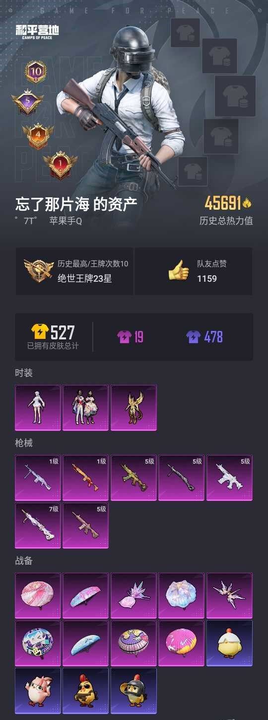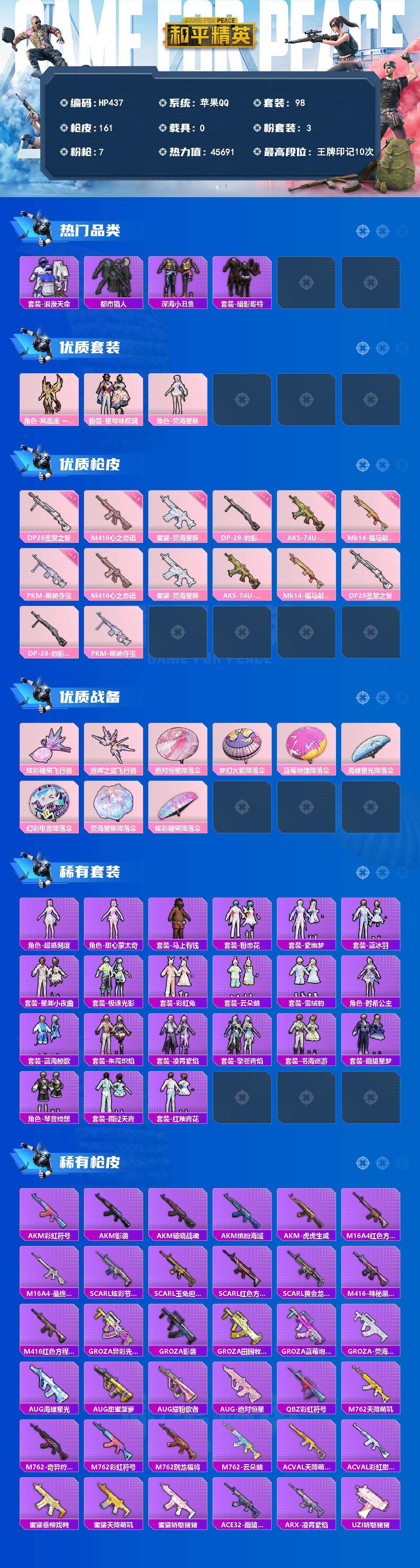 【秒换绑】苹果 手Q-3粉装-7特效枪-0载具-2粉色飞行器-45691热力值-10王牌印记-98套装-161枪皮
