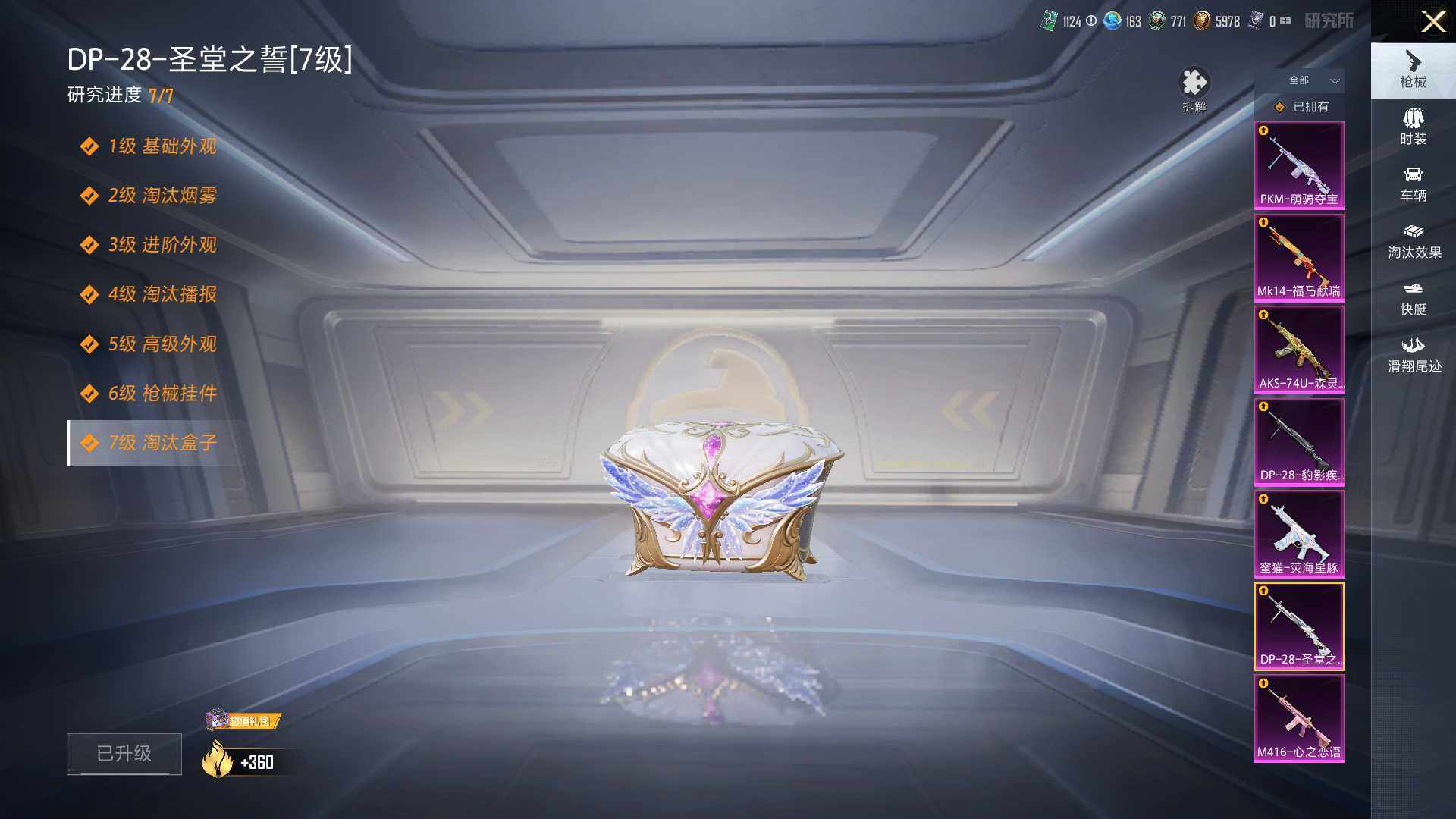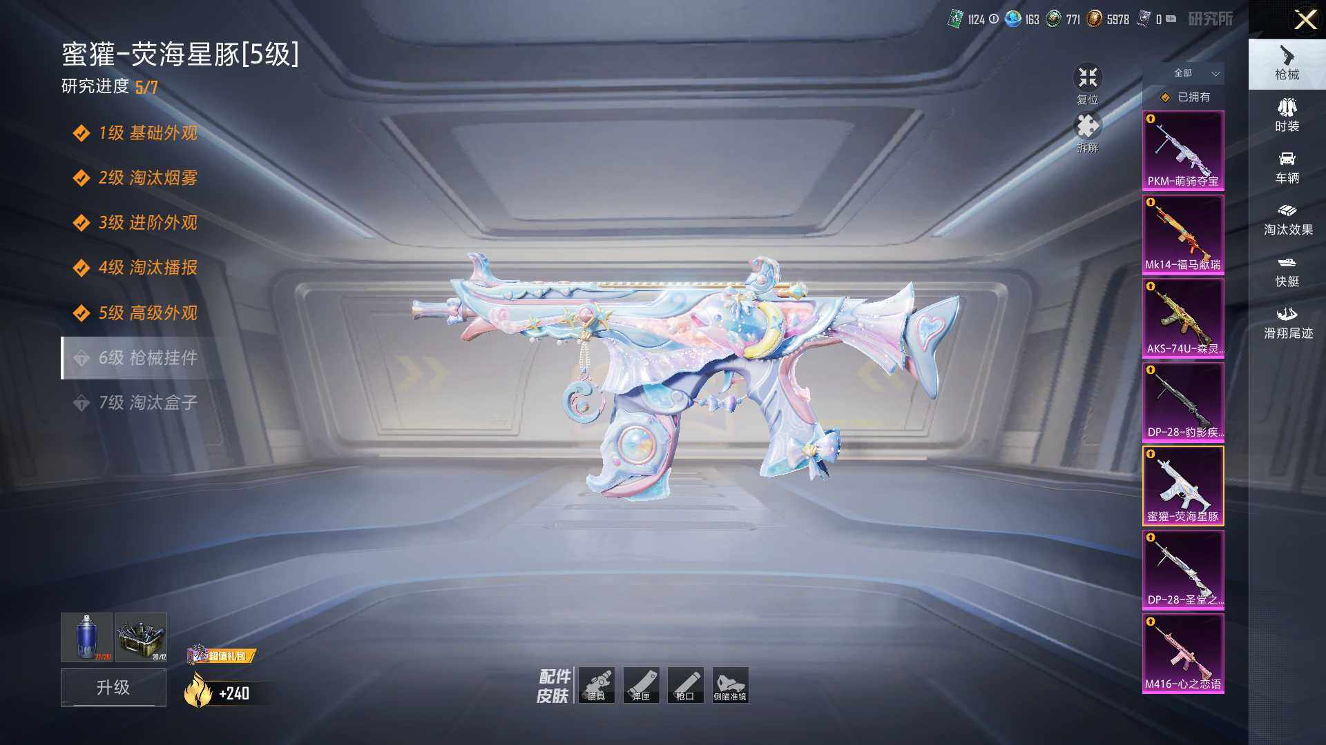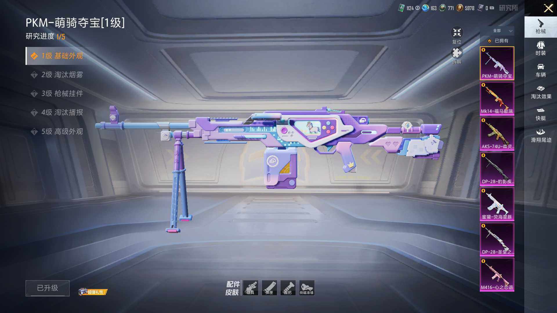 【粉色枪皮等级】:M416-心之恋语(五级),蜜獾-荧海星豚(五级),AKS-74U-森灵之息(五级),Mk14-福马献瑞(一级),D