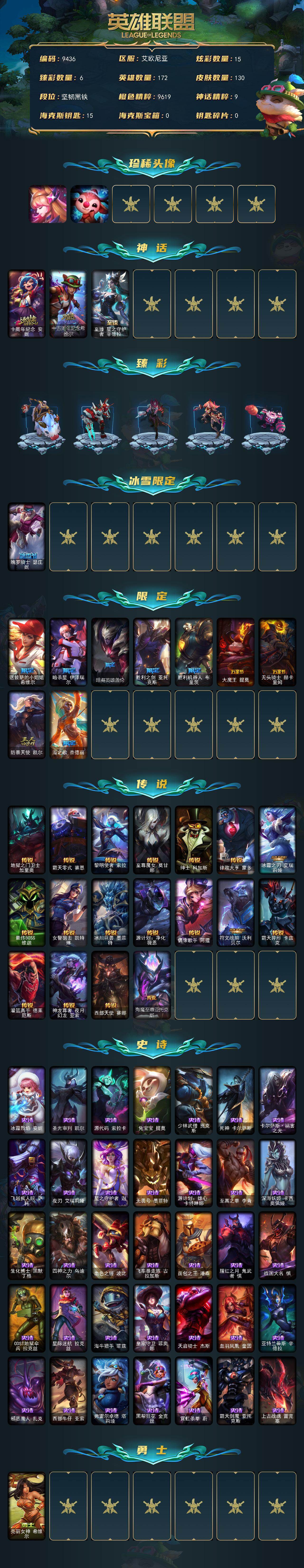 【皇冠号】未定级段位-172英雄-130皮肤-15炫彩-0终极-3神话-10限定-18传说-35史诗