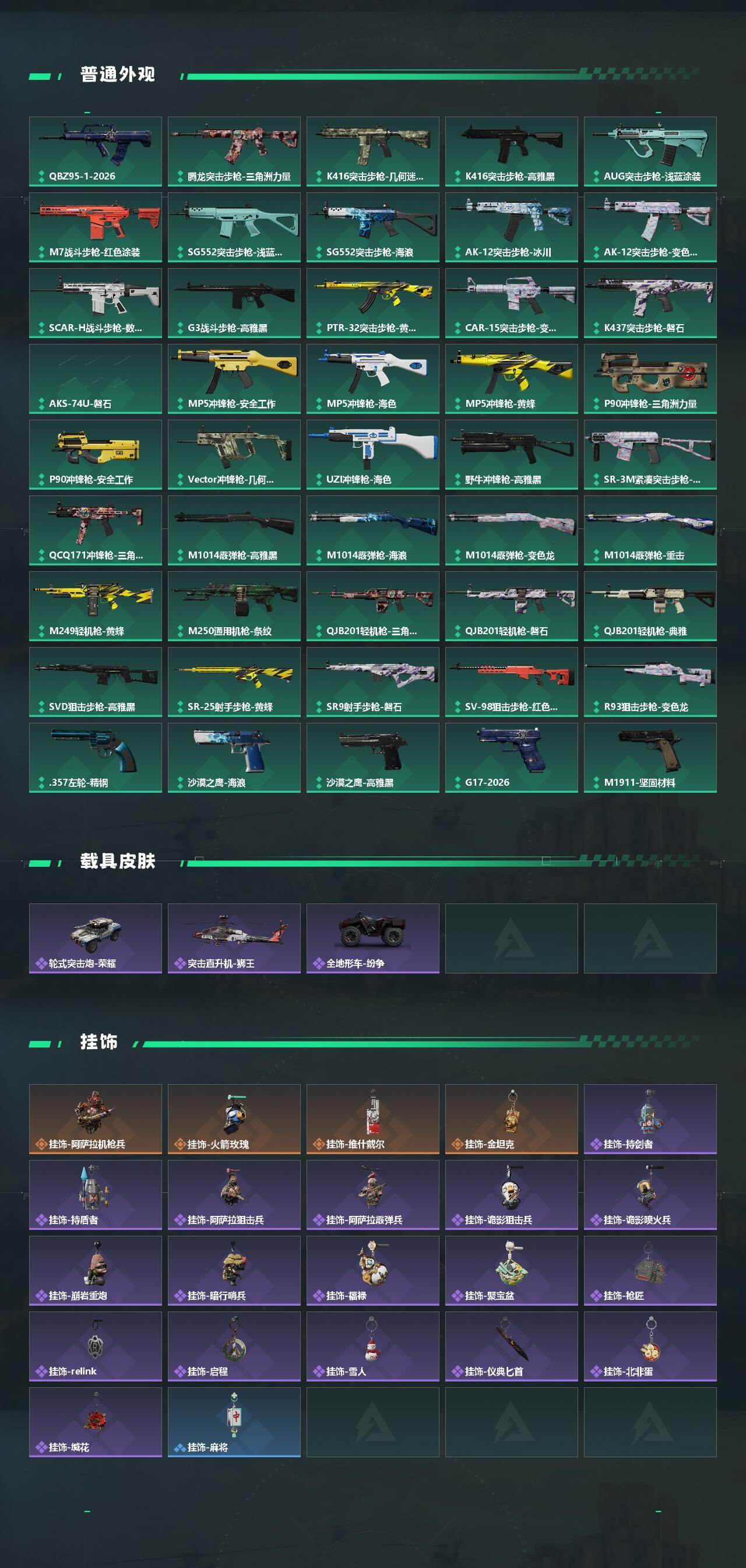 【传说外观】:M4A1突击步枪-蚀金玫瑰,SG552突击步枪-运动员,SCAR-H战斗步枪-启航,KC17突击步枪-电锯惊魂,M14射手步枪-缄花,SR-25射手步枪-水墨云图,SR-25射手步枪-缄花,R93狙击步枪-维什戴尔,.357左轮-缄花