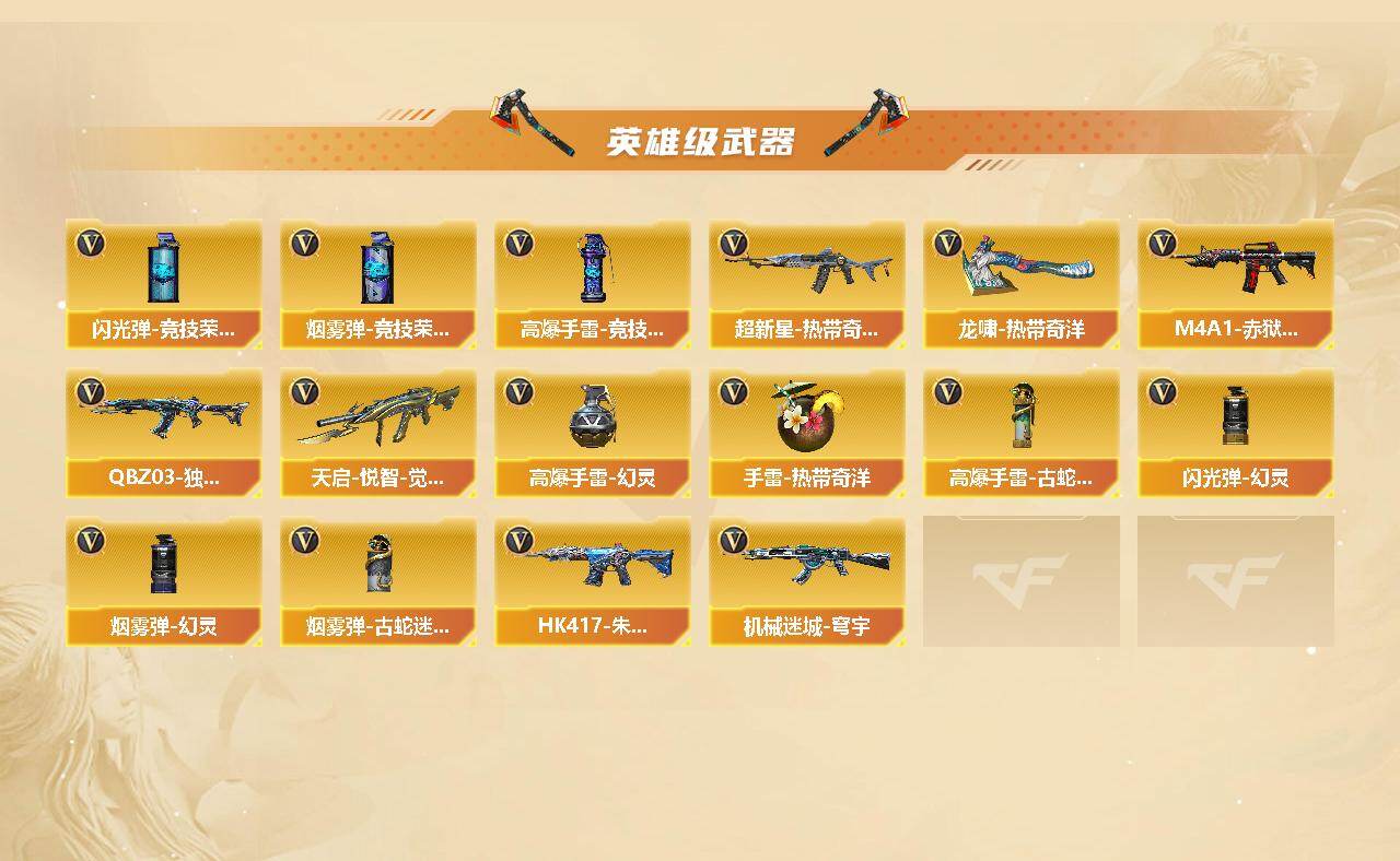 【热门武器】:QBZ03-金色蔷薇,M200-幻神,金色蔷薇-古蛇迷踪,修罗-古蛇迷踪,M200-竞技荣光,C.A.T,M4A1-黑骑士,COP-白鲨,COP 357-幻灵,沙鹰-修罗,Knife-冠军之刃