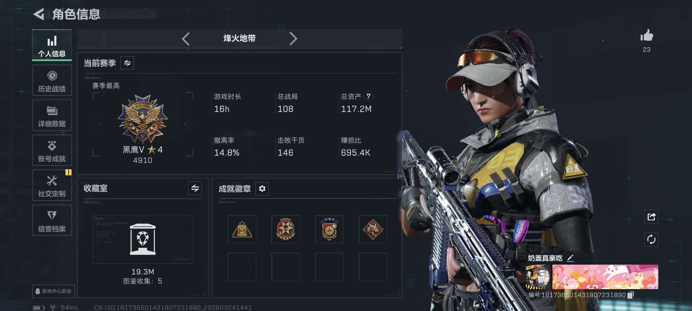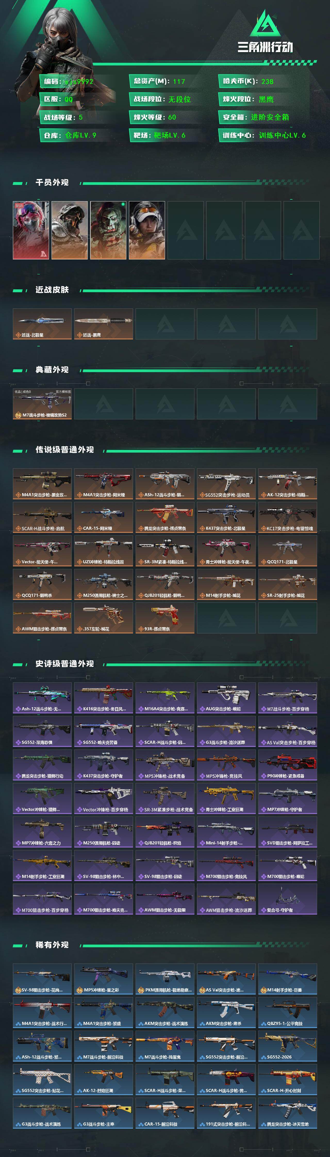 117m总资产-238k哈夫币-60烽火等级-黑鹰-5战场等级-无军衔
