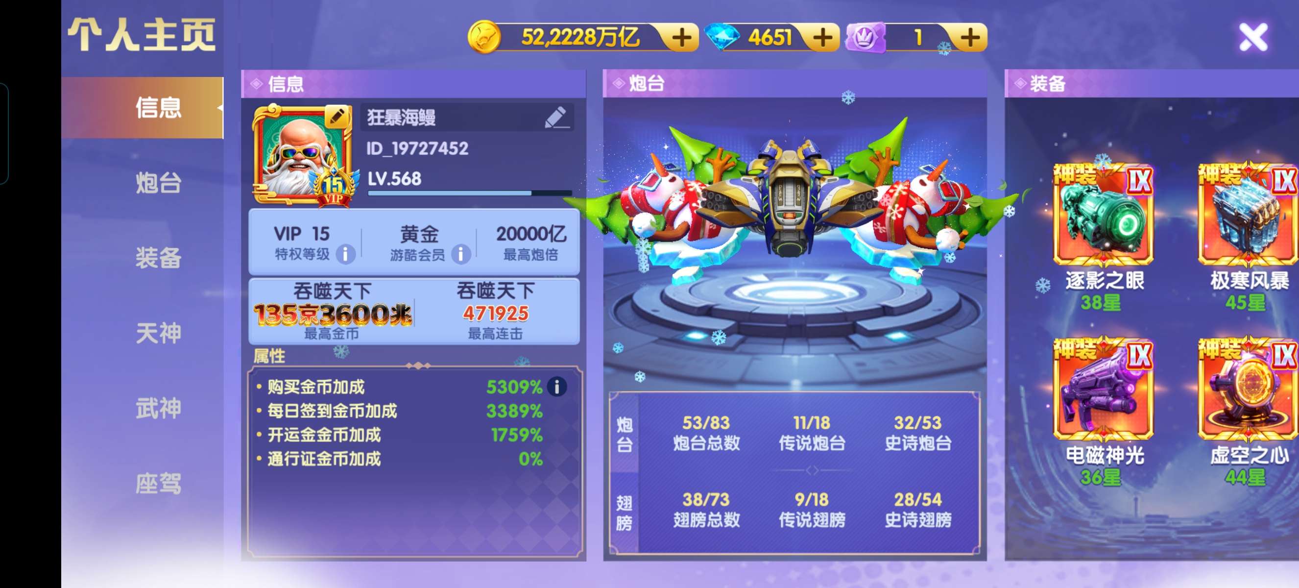 充值2W+VIP15自带五十京金币天神全三级,装备全满级磁炮超神一级,月卡赛季全开武神3600斩击,