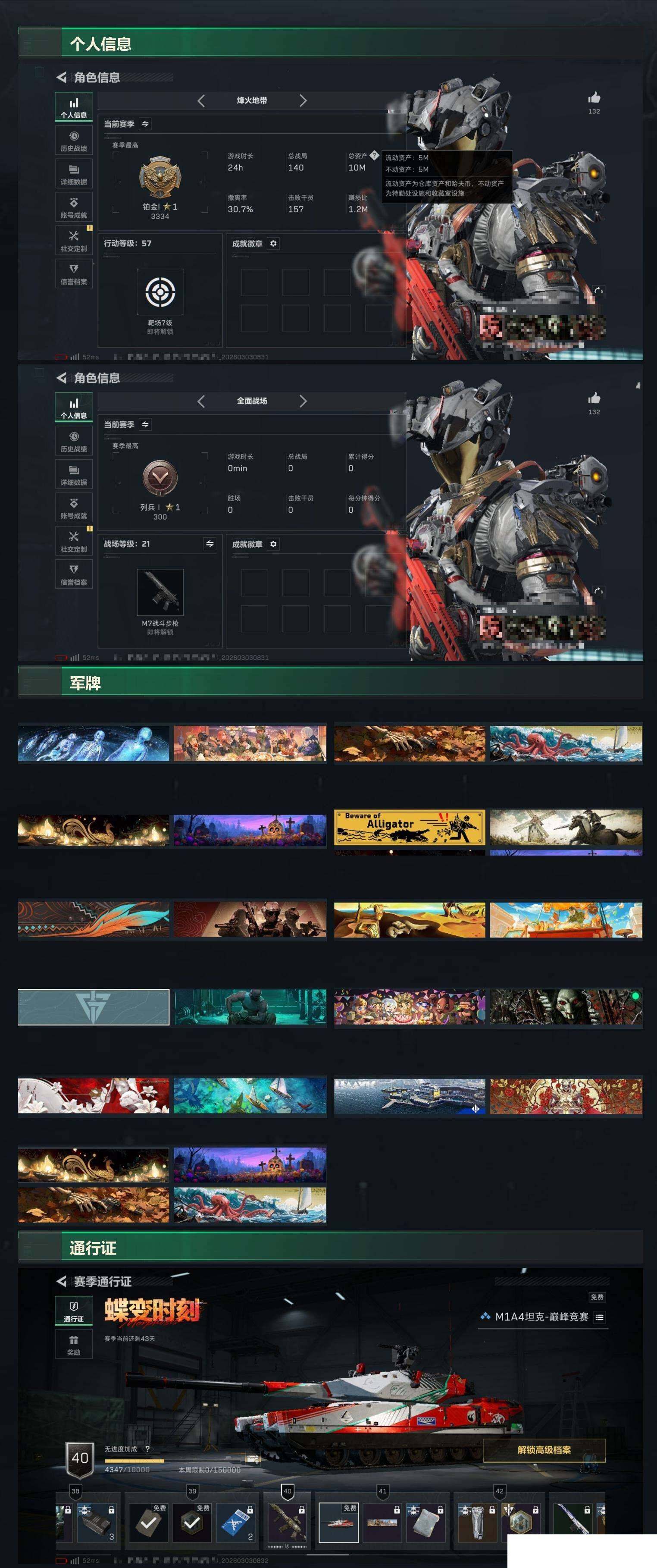 10m 维什+戍卫 烽火地带段位: 铂金 全面战场段位: 列兵 总资产: 10000000 哈夫币: 1965000