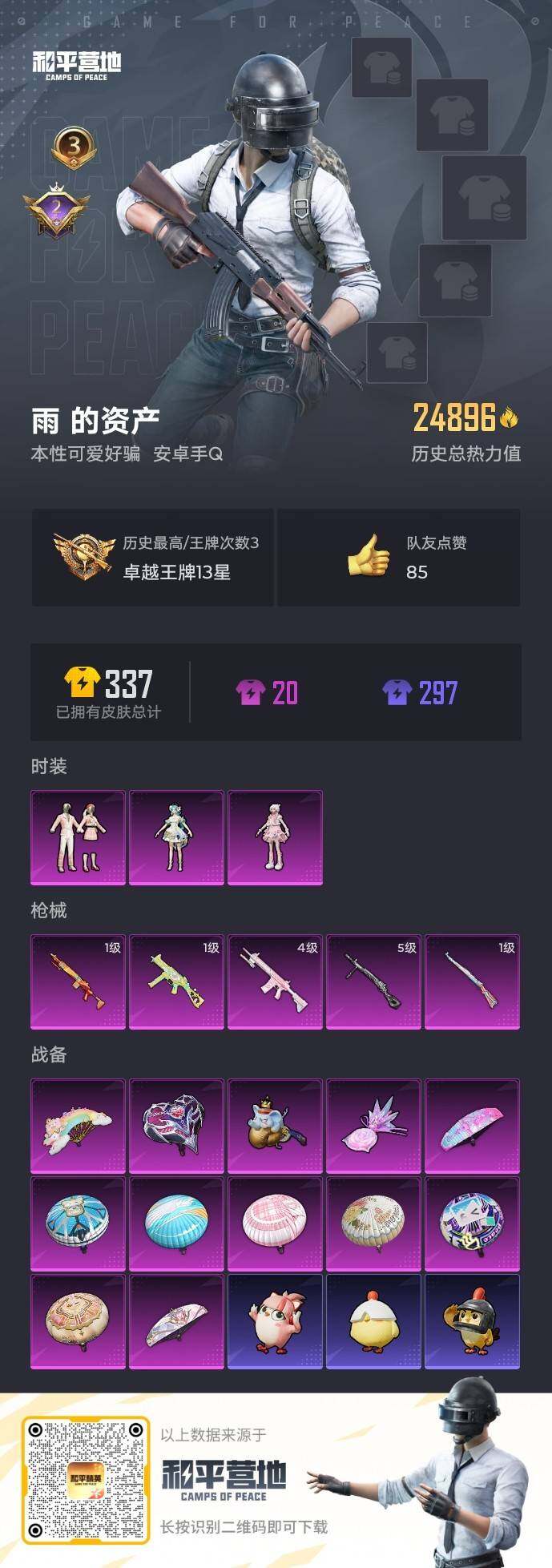 安卓 手Q-3粉装-5特效枪-0载具-2粉色飞行器-24896热力值-3王牌印记-72套装-86枪皮