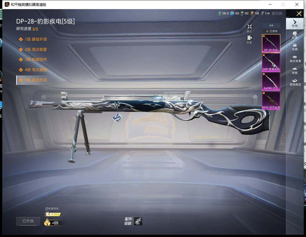 【粉色枪皮等级】:M416-五爪金龙(七级),Kar98K-巳巳如意(一级),AMR-智耀战神(七级),DP-28-豹影疾电(五级)