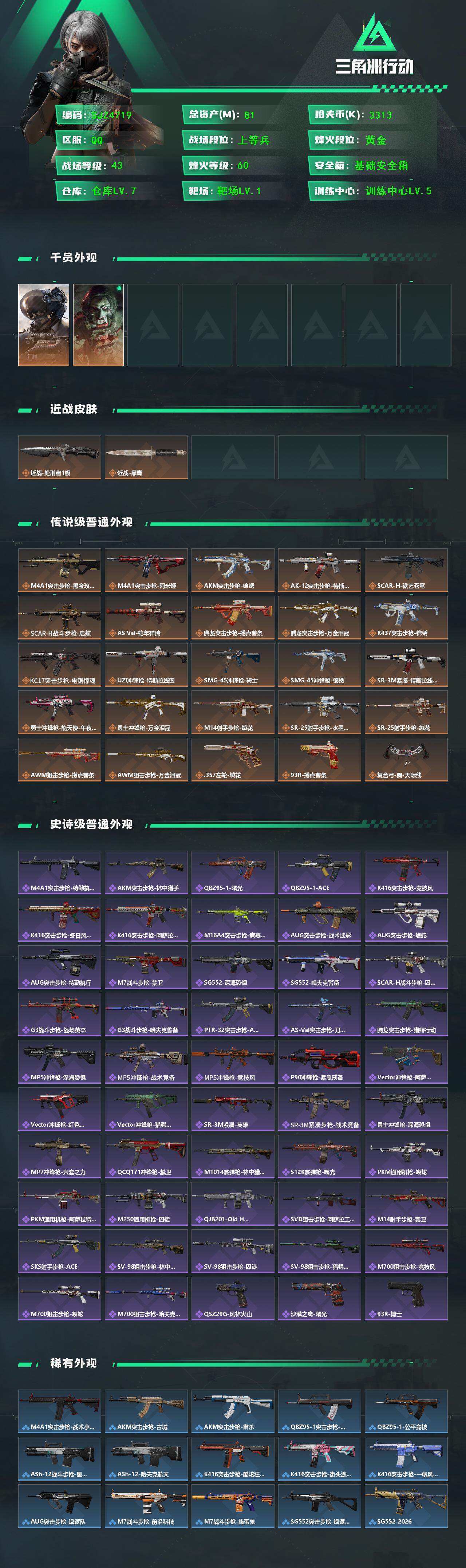 【SJZ4719】总资产(M):81M/哈夫币(K):3313K/哈夫币(K):3313K/传说枪皮数:25/全面战场等级:43_段位:上等兵/烽火地带等级:60_段位:黄金/威龙-壮志凌云/红狼-电锯惊魂/近战-处刑者1级/近战-黑鹰/M4A1突击步枪-蚀金玫瑰/M4A1突击步枪-阿米娅/AKM突击步枪-锦绣/AK-12突击步枪-特斯拉线圈/SCAR-H战斗步枪-铁艺苍穹/SCAR-H战斗步枪-启航/AS Val突击步枪-蛇年祥瑞/腾龙突击步枪-捞点薯条/腾龙突击步枪-万金泪冠/K437突击步