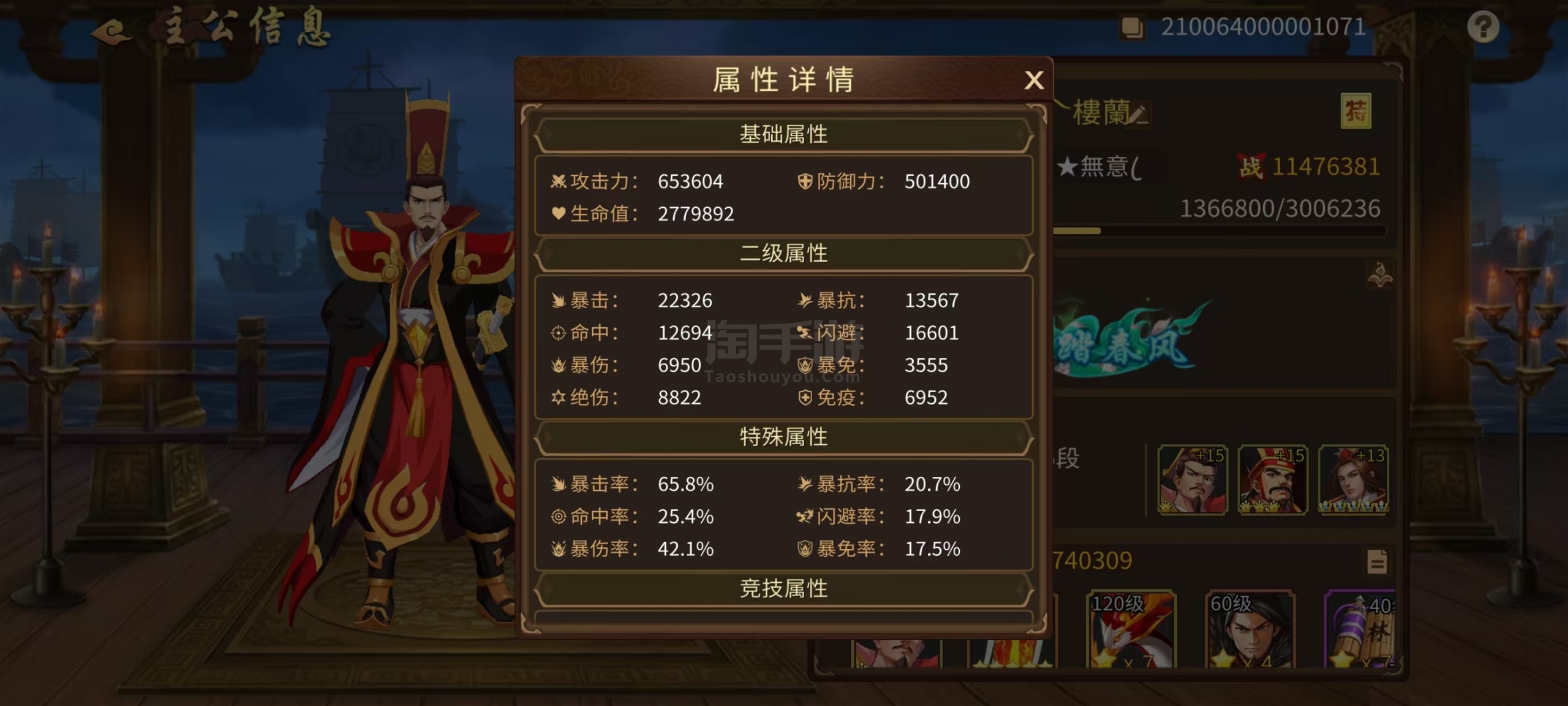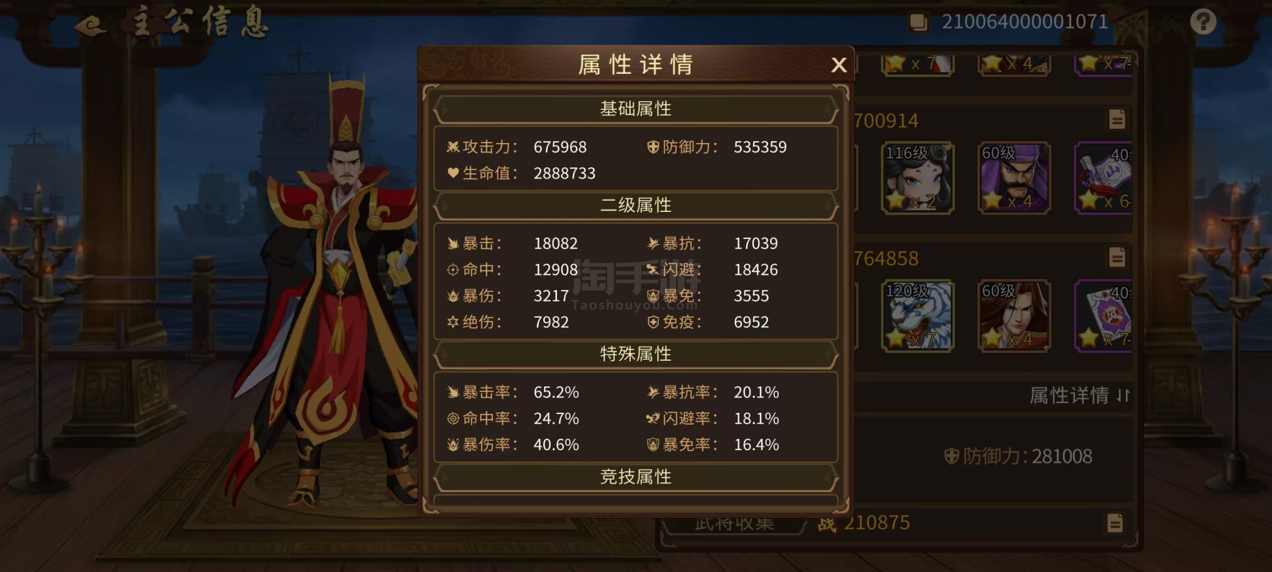 OPPO全渠道账号,攻击66万,玩累了,退游号,自己看图,懂得自然懂。 第一军团资源好,刘协已开,可以带秘境六,天三。 命中一万四+闪避二万+暴击二万四+ 排位乱杀。武将自己看。