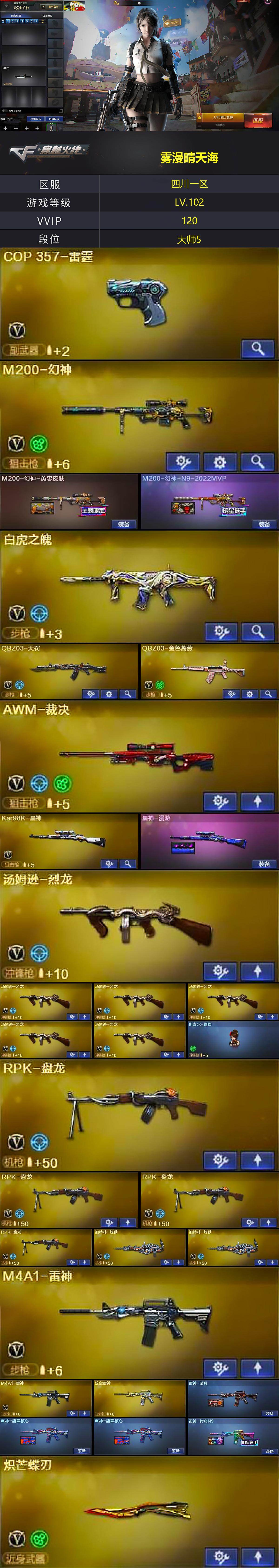 四川一区-119V-9王者武器数-6炫金武器数【热门武器】:QBZ03-金色蔷薇,M200-幻神,死亡之眼,Kar98K-星神,金色小号,炼狱-迷你小钢,M4A1-黑骑士,汤姆逊-烈龙*6,RPK-盘龙*4,加特林-炼狱*2,斯泰尔-蝴蝶,COP-白鲨,沙鹰-修罗*4,炽芒蝶刃,金刚伞【王者炫金武器】:王者之城,玫瑰精灵-悦动,王者之光,王者蔷薇,Barrett-雷霆王者,王者之啸,炫金骑士,炫金千变,炫金雷神,炫金武士,炫金天神*2【音效卡】:M4A1-黑骑士音效卡,Barrett-毁灭音效卡