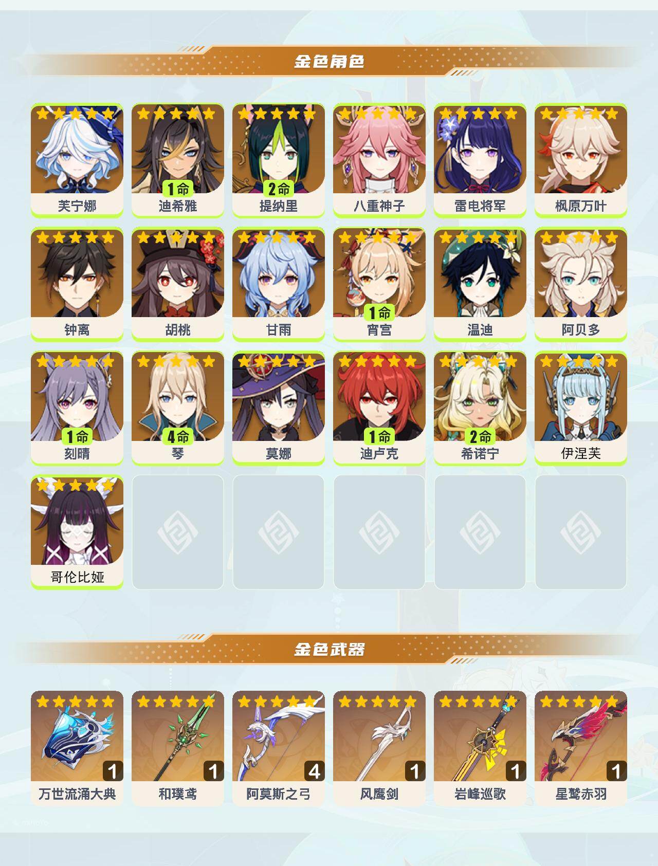 0命芙宁娜,1命迪希雅,2命提纳里,0命八重神子,0命雷电将军,0命枫原万叶,0命钟离,0命胡桃,0命甘雨,1命宵宫,0命温迪,0命阿贝多,1命刻晴,4命琴,0命莫娜,1命迪卢克,2命希诺宁,0命伊涅芙,0命哥伦比娅,精1万世流涌大典,精1和璞鸢,精4阿莫斯之弓,精1风鹰剑,精1岩峰巡歌,精1星鹫赤羽