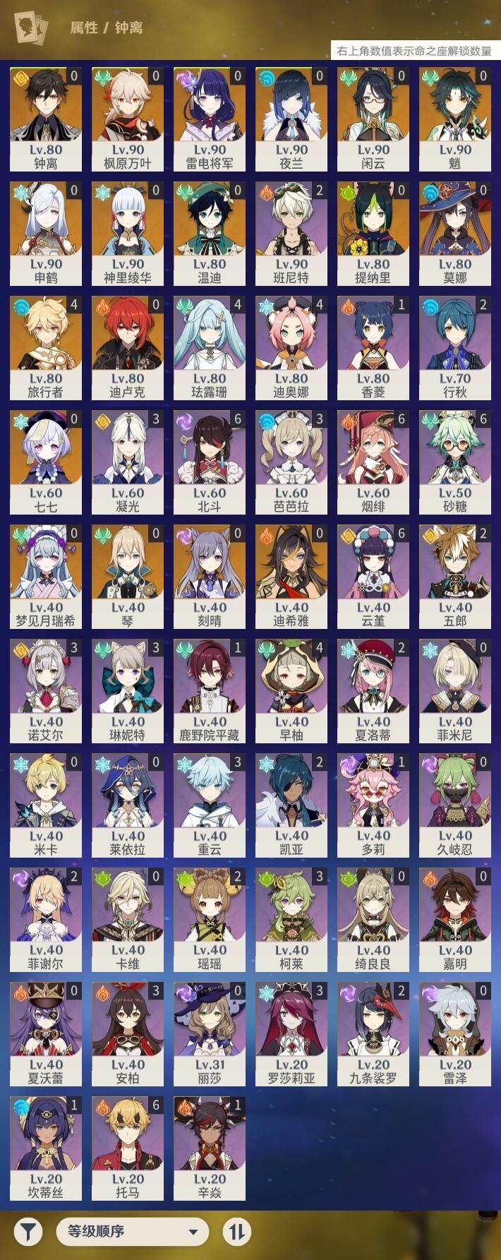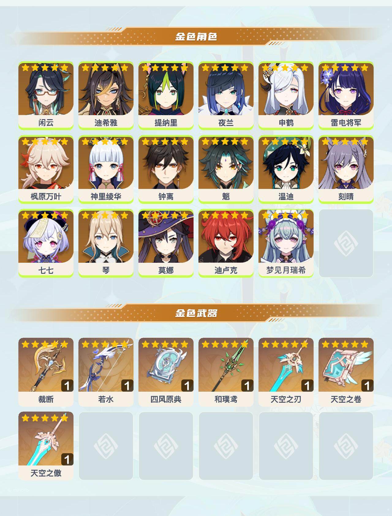 0命闲云,0命迪希雅,0命提纳里,0命夜兰,0命申鹤,0命雷电将军,0命枫原万叶,0命神里绫华,0命钟离,0命魈,0命温迪,0命刻晴,0命七七,0命琴,0命莫娜,0命迪卢克,0命梦见月瑞希,精1裁断,精1若水,精1四风原典,精1和璞鸢,精1天空之刃,精1天空之卷,精1天空之傲