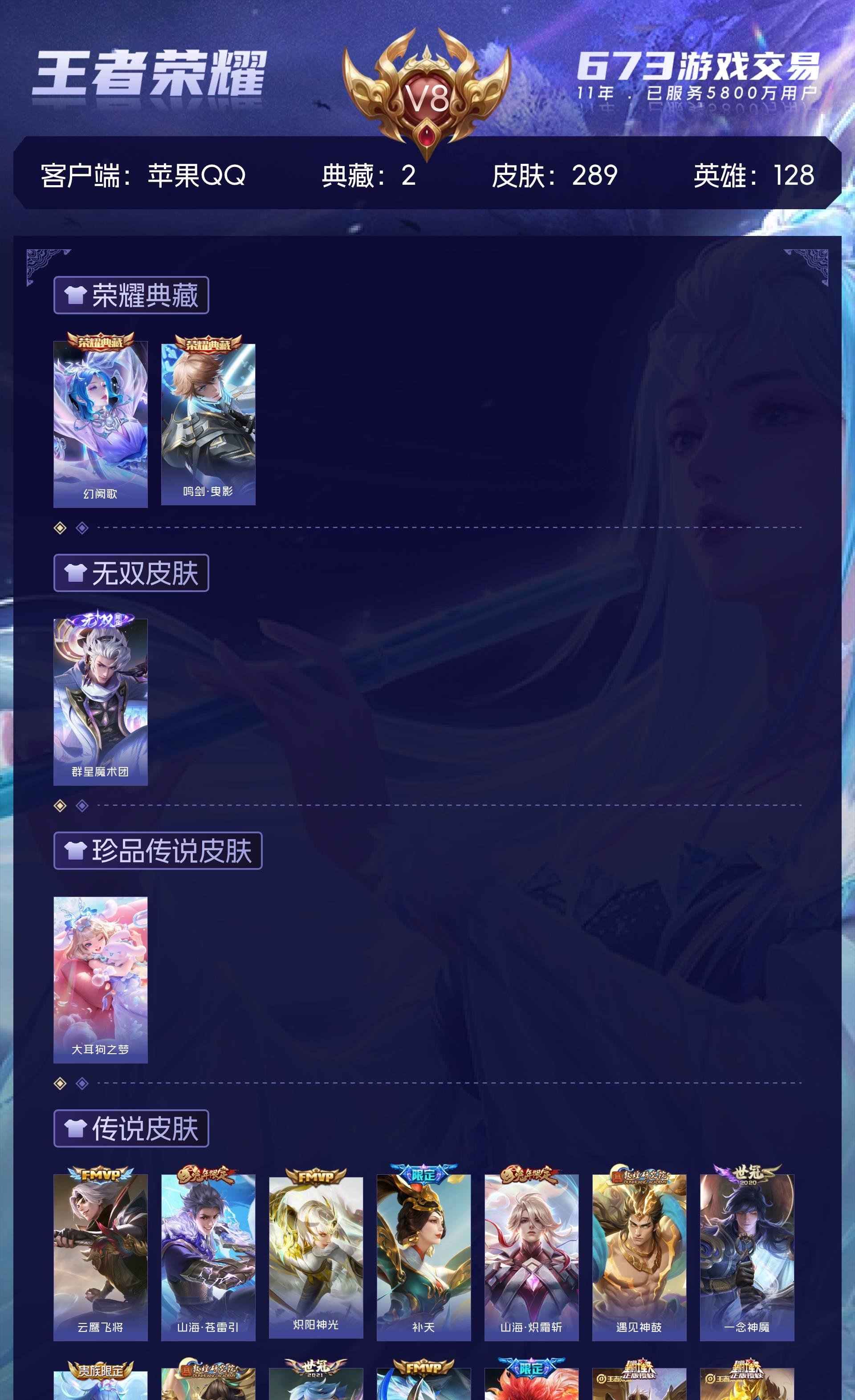 苹果Q-包脸-V8-289皮肤-2典藏-1无双-1珍品传说-2星元-31传说-100史诗-12个性按键-228夺宝积分