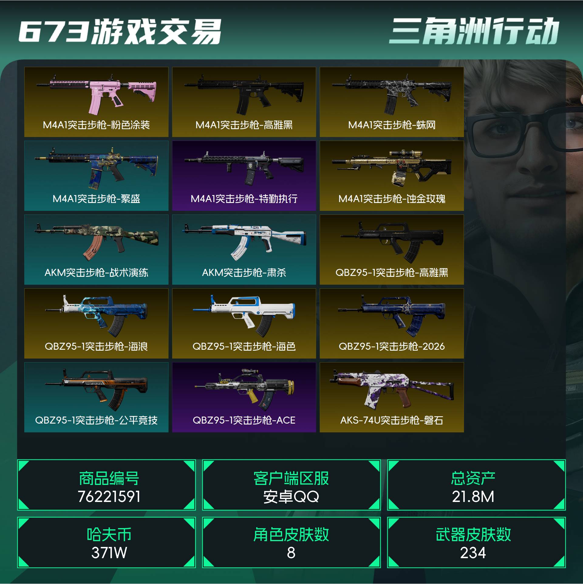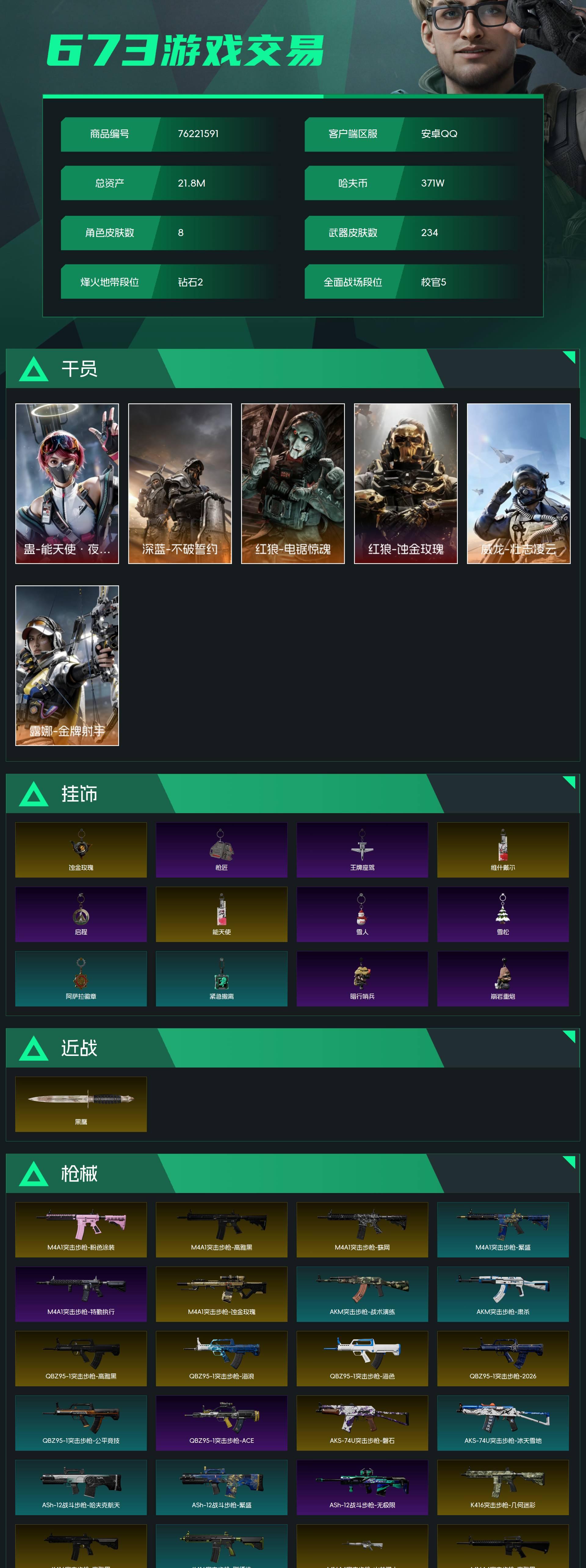烽火段位钻石2 战场段位校官5 总资产21.8M 哈夫币371W 干员8 挂饰19 近战3 枪械234 载具22