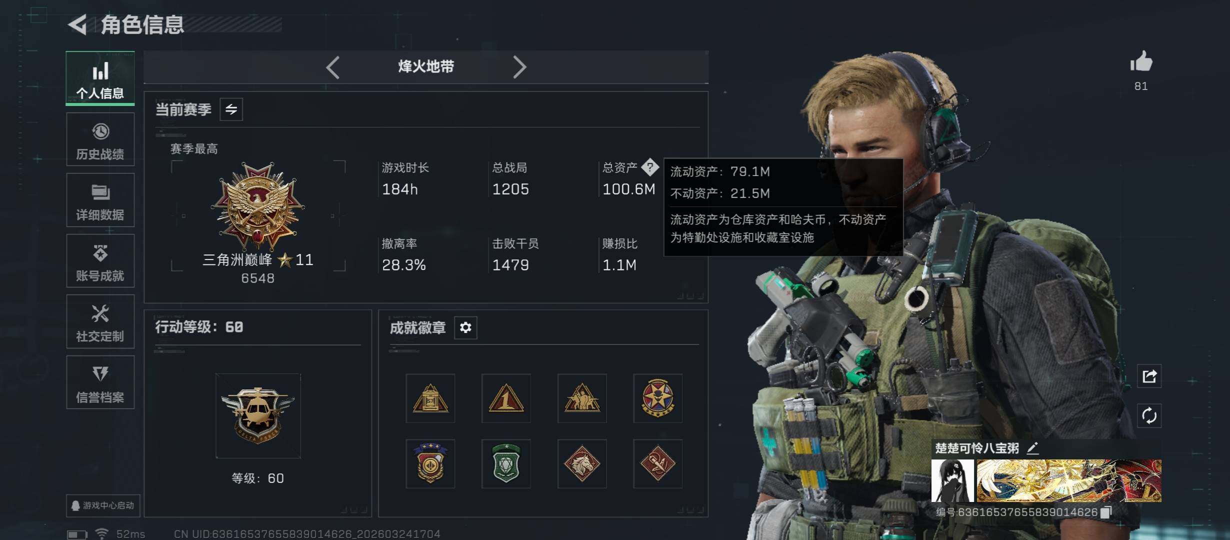 【多热门刀皮号:四刀皮,怜悯+暗星+信条+处刑者3阶段】【Q区三端互通】【无二次】YXz9582-特勤处:仓库6级/靶场7级/训练中心7级100m总资产-1047w哈夫币-60烽火等级-三角洲巅峰-9战场等级-列兵