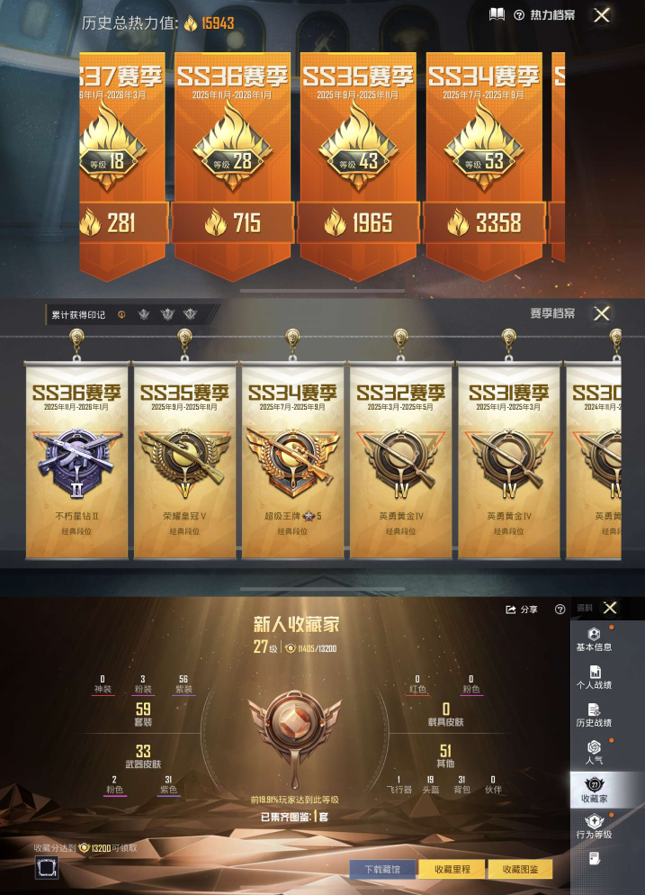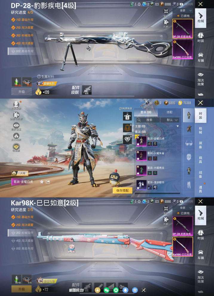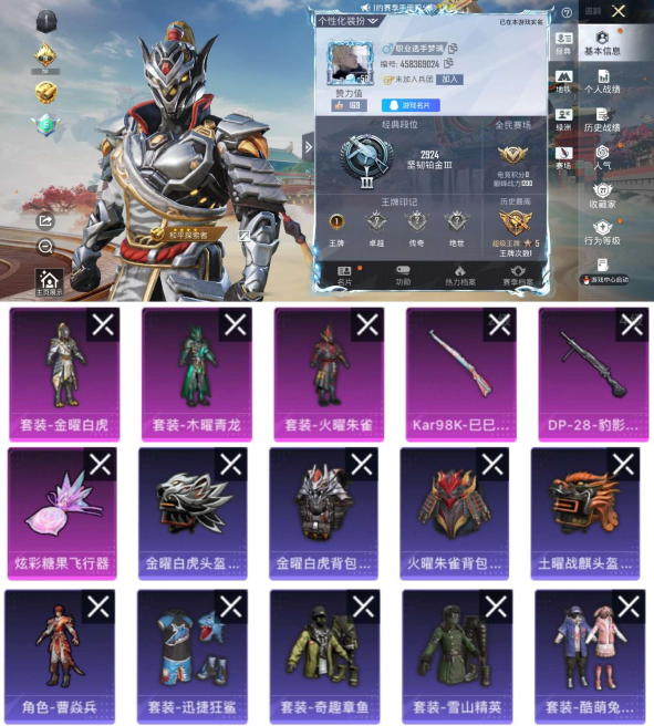 -3粉装-2特效枪-地铁已开-15943热力值-1王牌印记-59套装-46枪皮【优质套装】: 金曜白虎 木曜青龙 火曜朱雀【特效枪等级】:Kar98K-巳巳如意(二级- Kar98K-巳巳如意)【优质武器皮肤】: Kar98K-巳巳如意【稀有武器皮肤】: Kar98K-巳巳如意 M416-红色方程式 M416-乌木金纹 AKM-折纸暴龙 SCAR-L-乌木金纹 SCAR-L-金