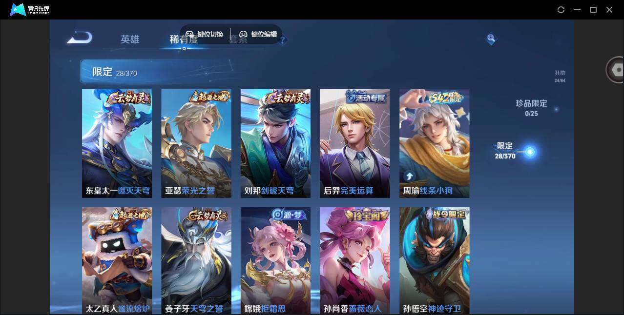 【限定皮肤】:姜子牙天穹之誓,狄仁杰阴阳师,孙尚香蔷薇恋人,项羽海滩派对,雅典娜黎明之约,裴擒虎擒涛扼浪,嫦娥拒霜思,鲁班大师探海日志,张良古海寻踪,蒙犽百解令,鬼谷子天穹祈灯,刘邦剑破天穹,