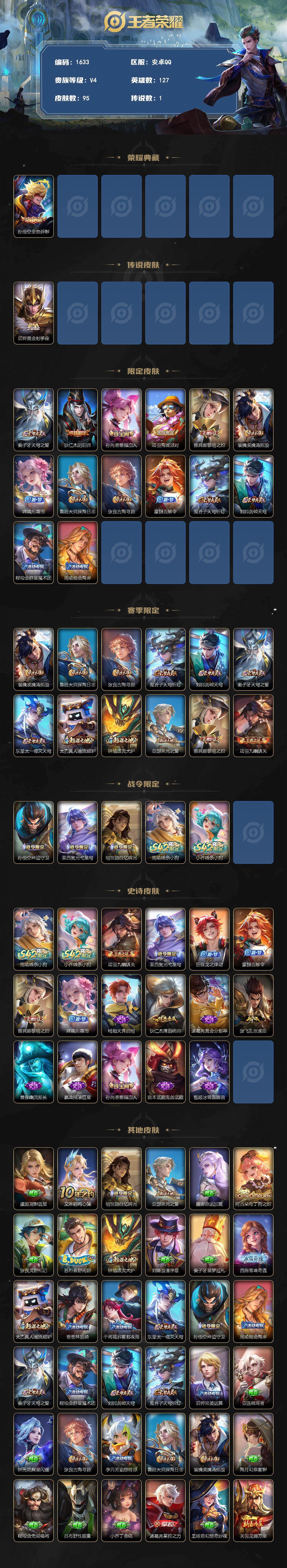 2655750 王者荣耀账号 安卓Q-V4-最强王者段位-127英雄-95皮肤-1典藏皮肤-1传说-16史诗