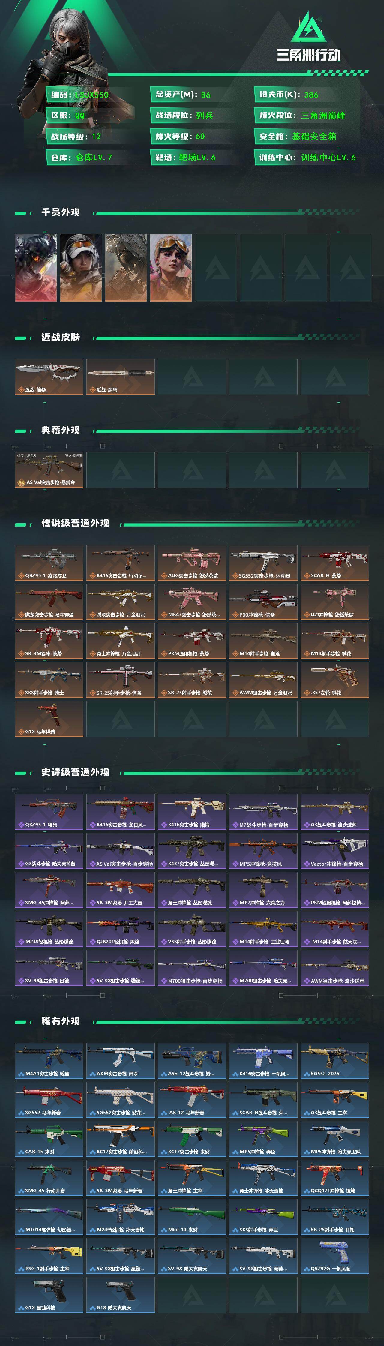 86m总资产-386k哈夫币-60烽火等级-三角洲巅峰-12战场等级-列兵