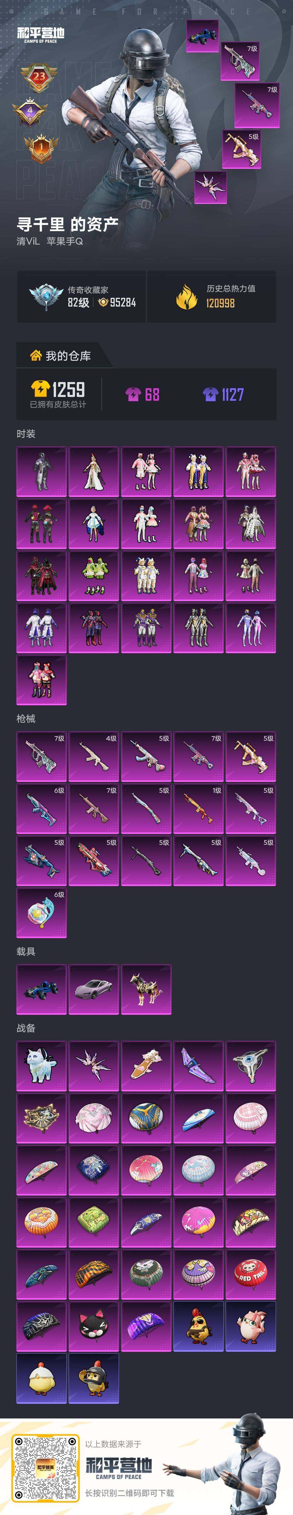 无敌战神框-21粉装-16特效枪-3载具-5粉色飞行器-120998热力值-23王牌印记-236套装-343枪皮