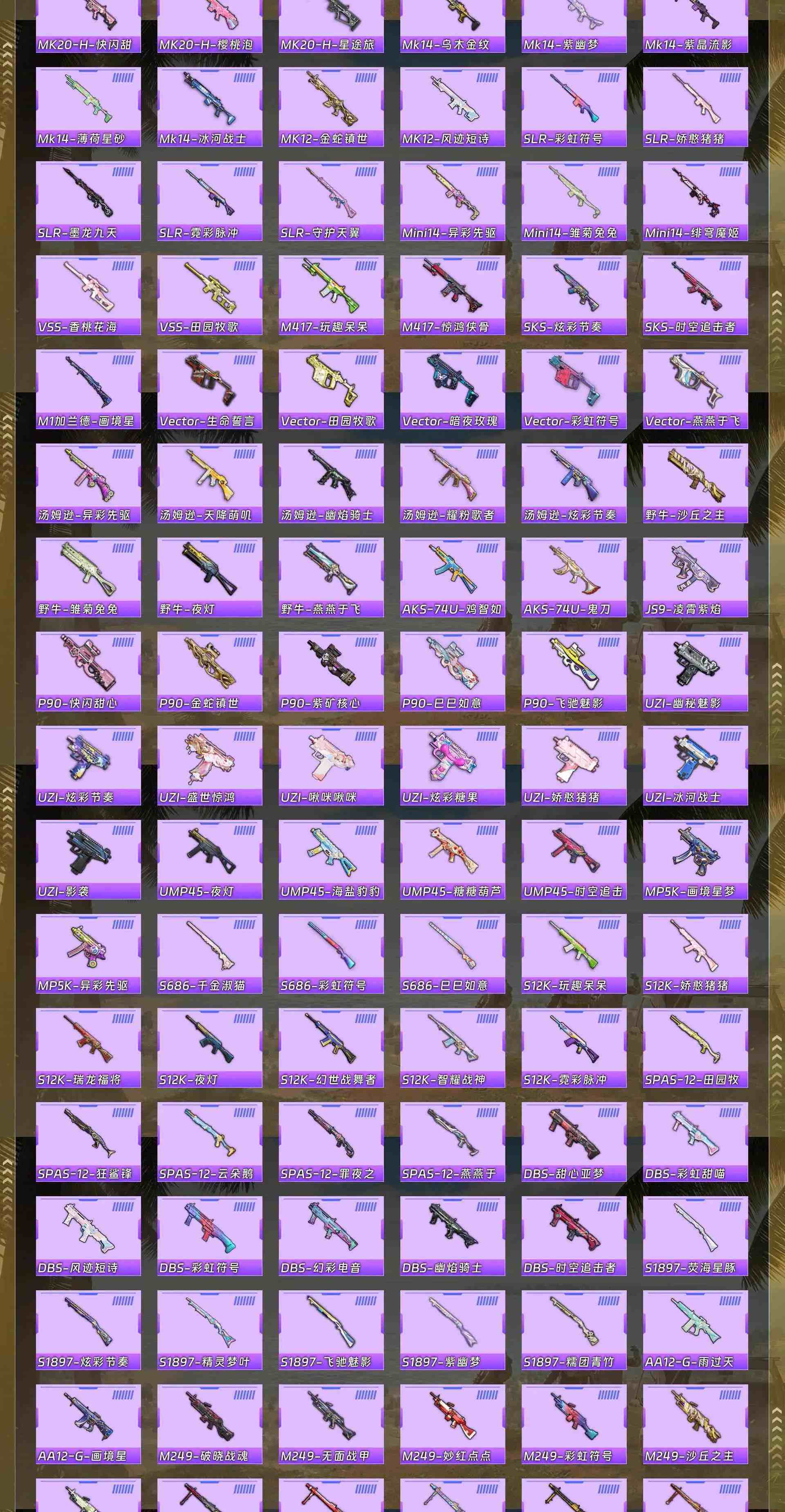 身法号-千金淑猫/AUG许七安7级/M4风花雪月7级/AKM幽焰骑士3级/SCAR金蛇镇世3级/Mk14盛世惊鸿3级/蓝螳螂/粉螳螂/都市/许七安/临安公主/怀庆长公主/乐音/冰公主/海琴烟/梦幻火箭/音爆索尼克/萨利娅/虎痴许褚/SCAR青春物语7级/莫辛纳甘未来领航者7级/Kar98K巳巳如意5级/AMR智耀战神5级/玛莎拉蒂蓝/盛世惊鸿摩托车/护世瑞兽(6粉装18粉枪3载具)HP6968-
