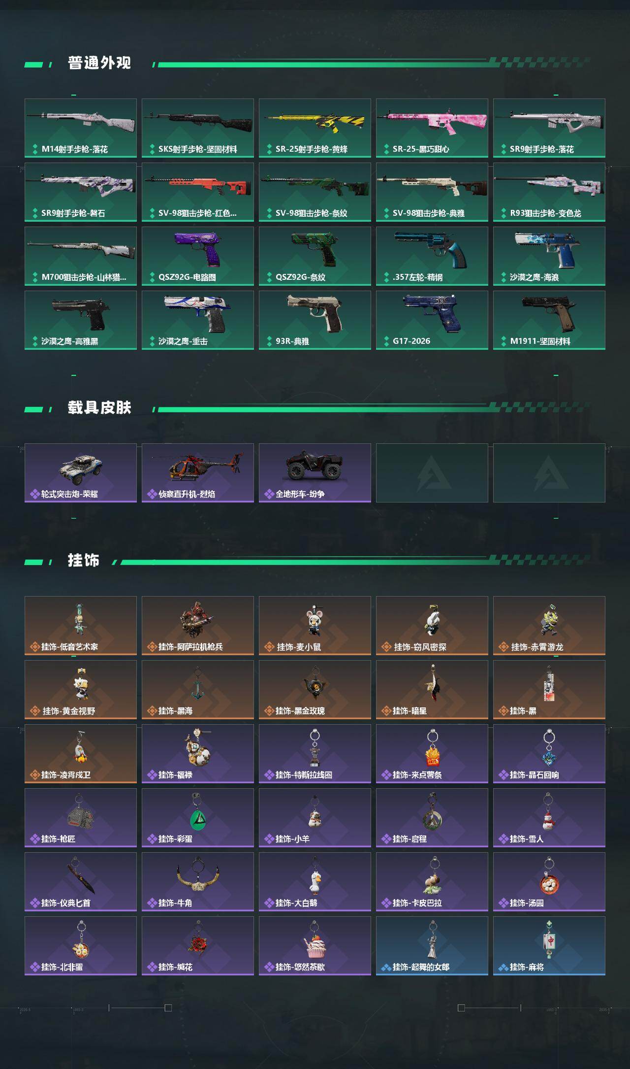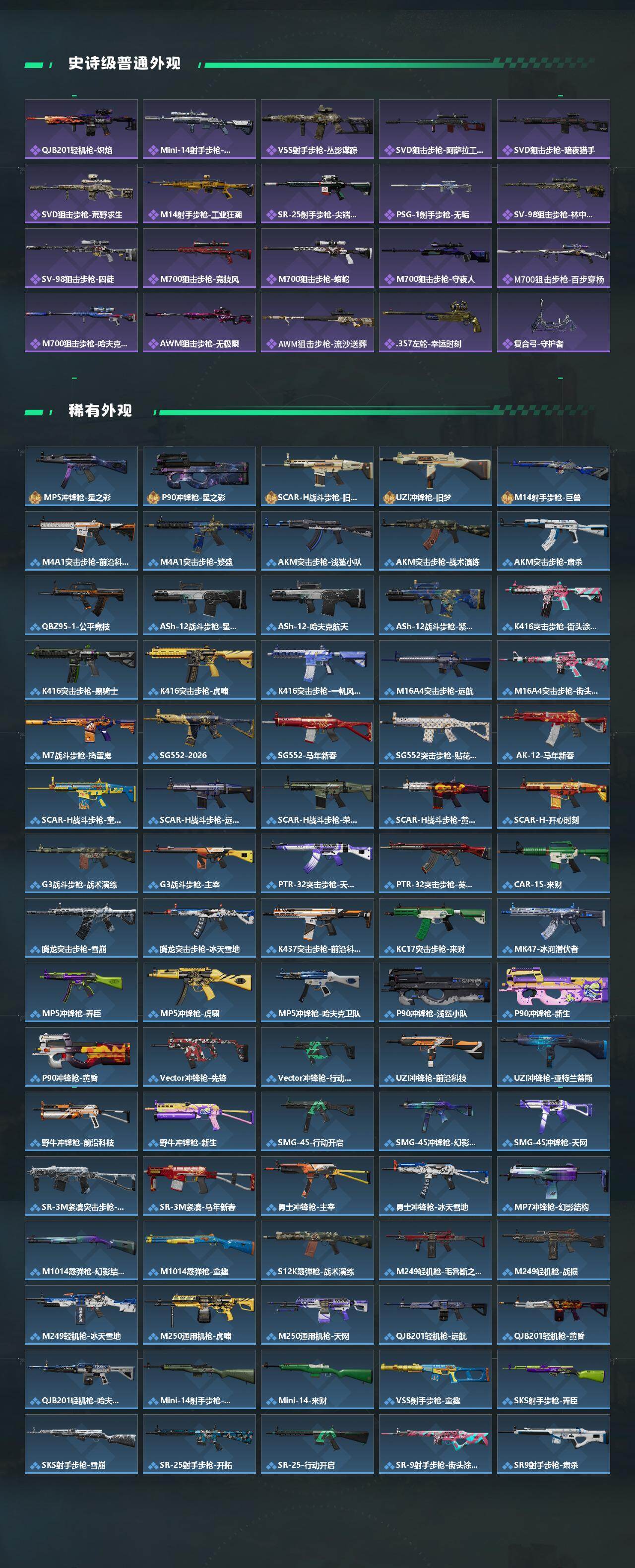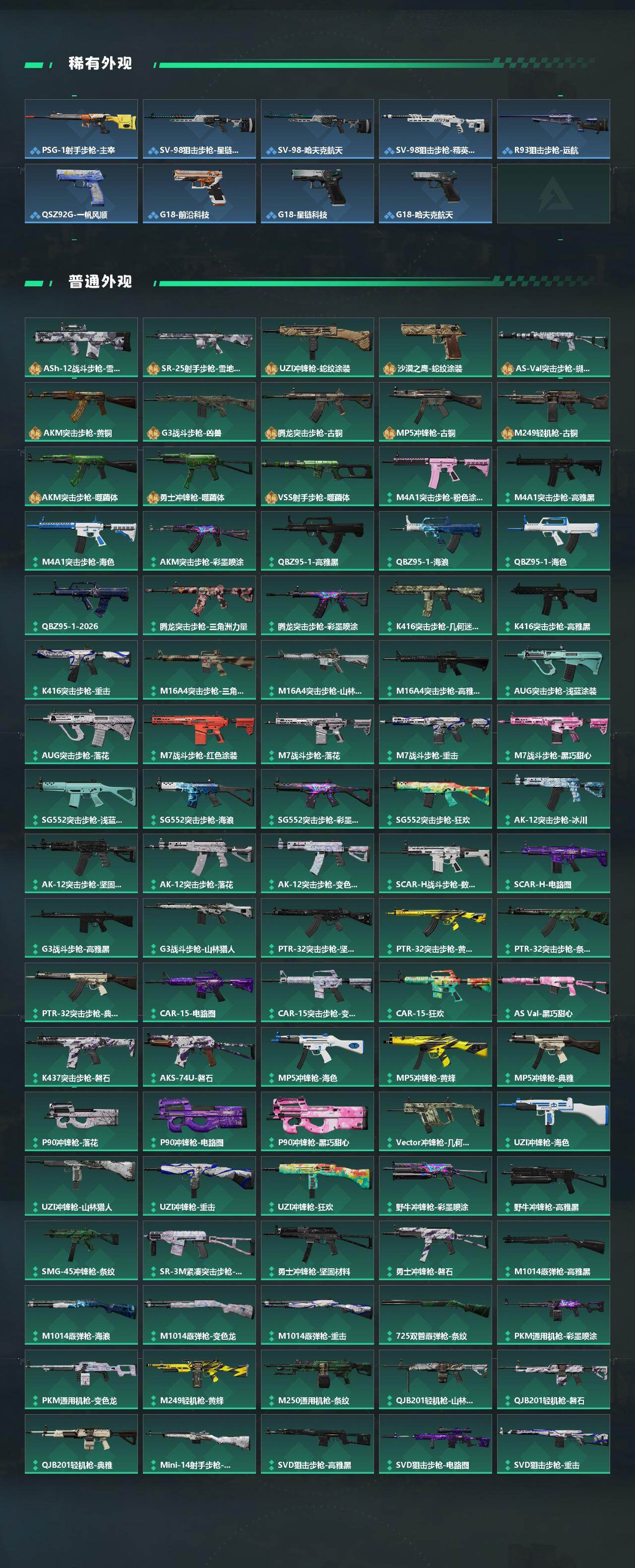 【传说外观】:M4A1突击步枪-蚀金玫瑰,M4A1突击步枪-阿米娅,AKM突击步枪-锦绣,QBZ95-1突