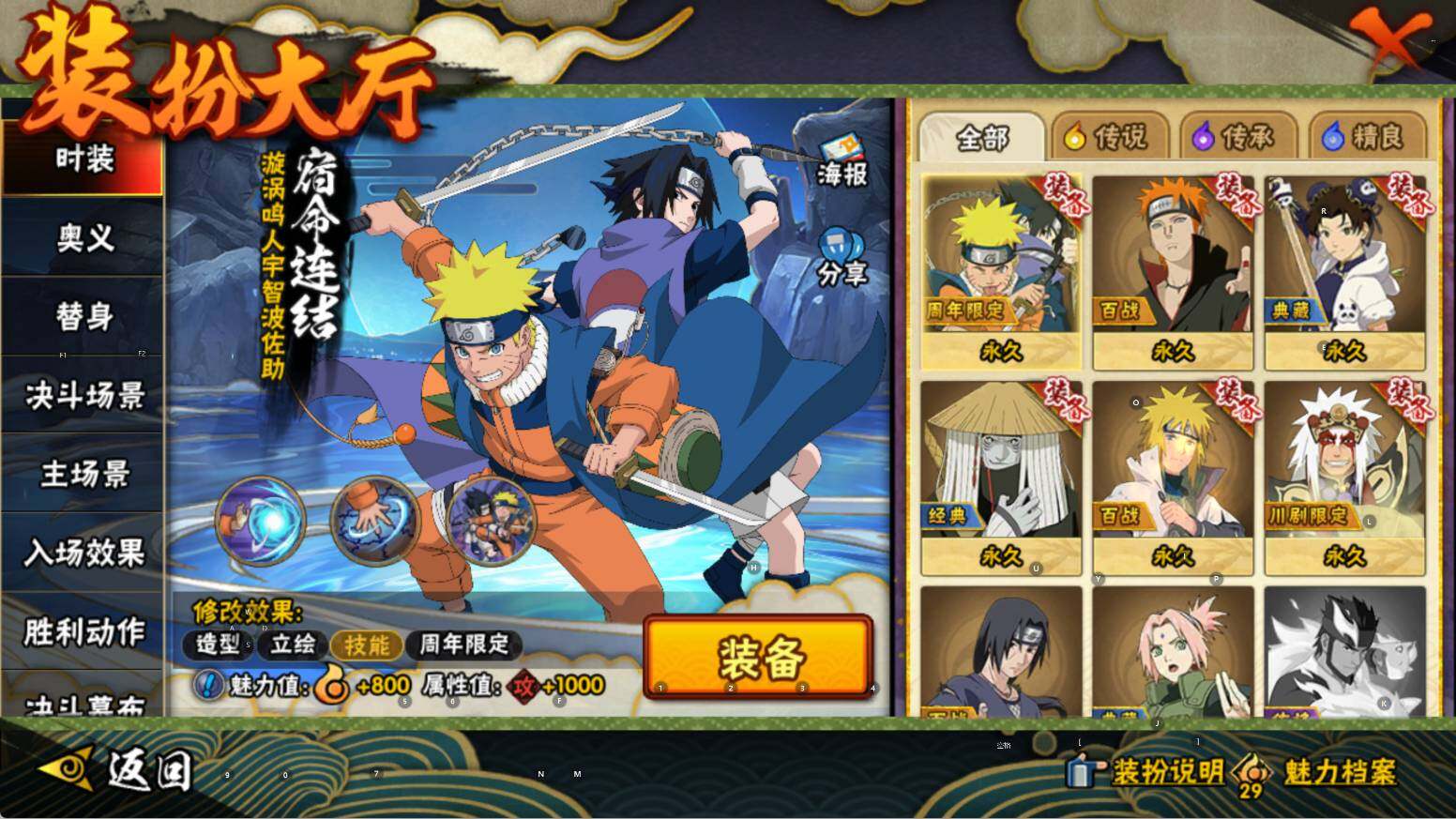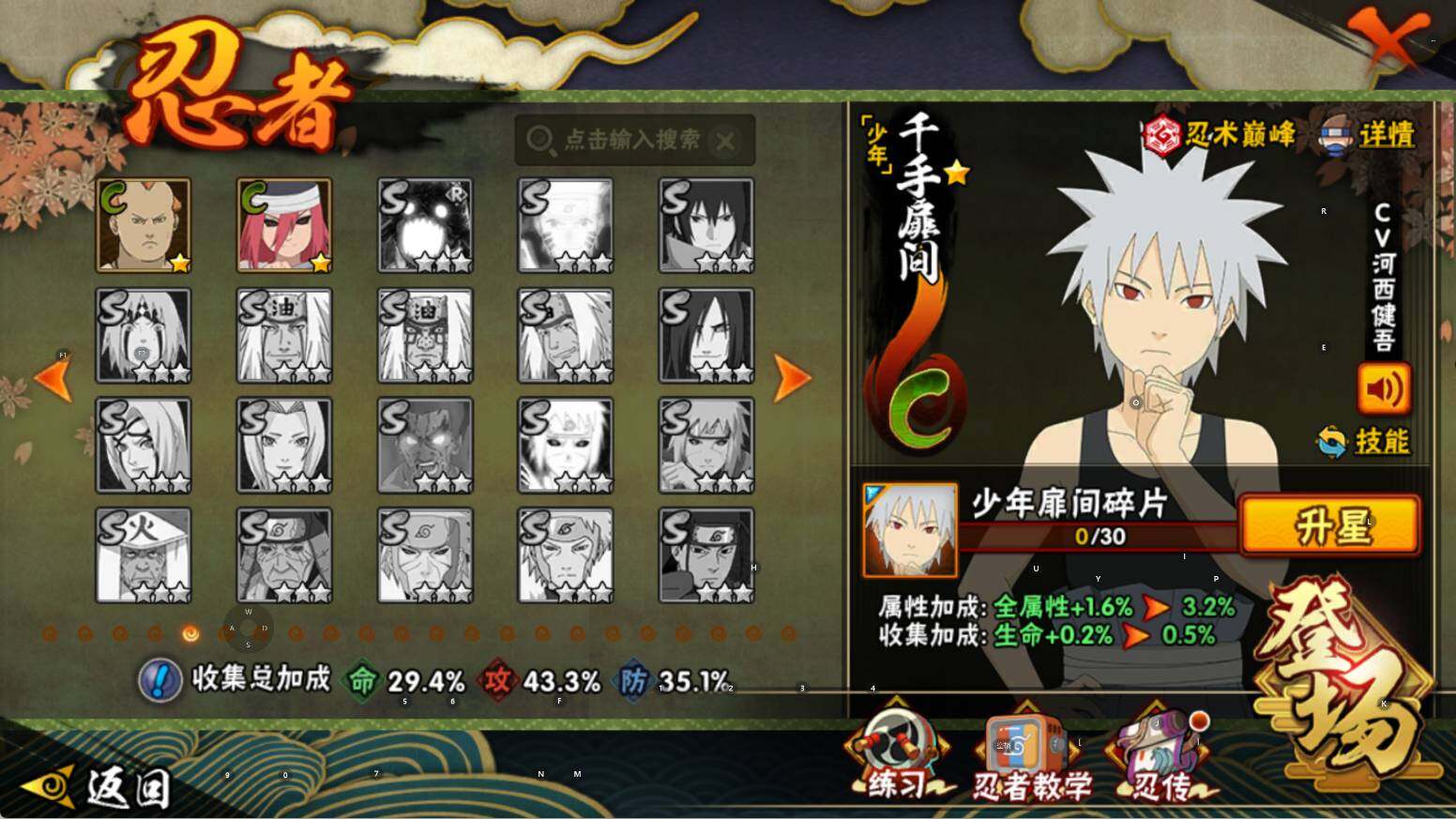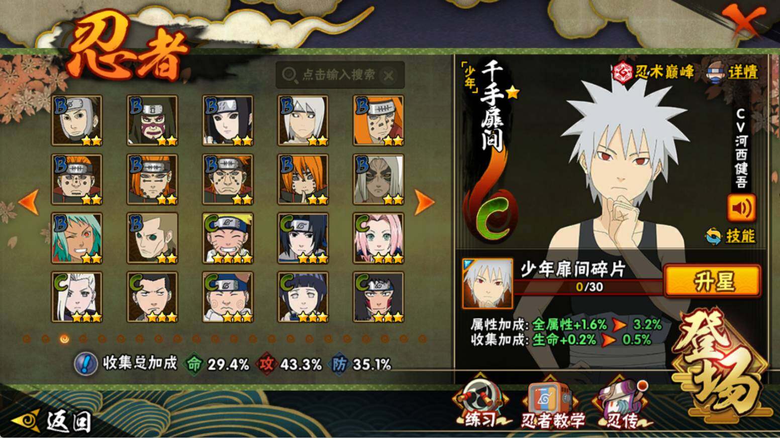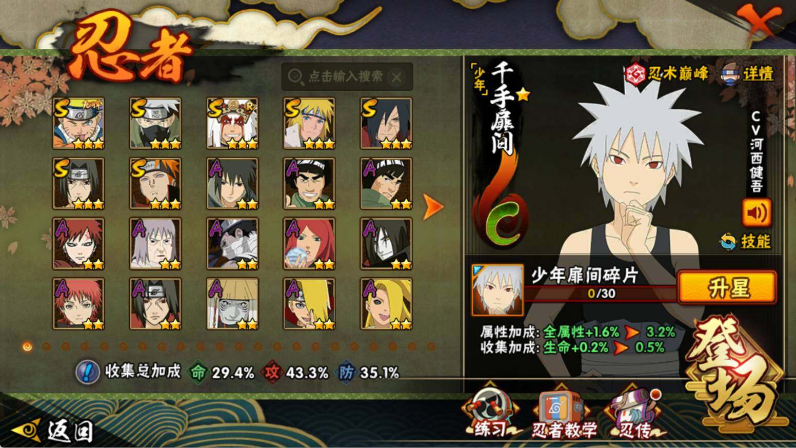 【S级忍者】:宇智波斑「秽土转生·解」(3星),宇智波鼬「须佐能乎」(3星),旗木卡卡西「须佐能乎」(3星),自来也「舞之豪杰」(3星),波风水门(3星),佩恩「天道」(3星),漩涡鸣人·宇智波佐助(3星)