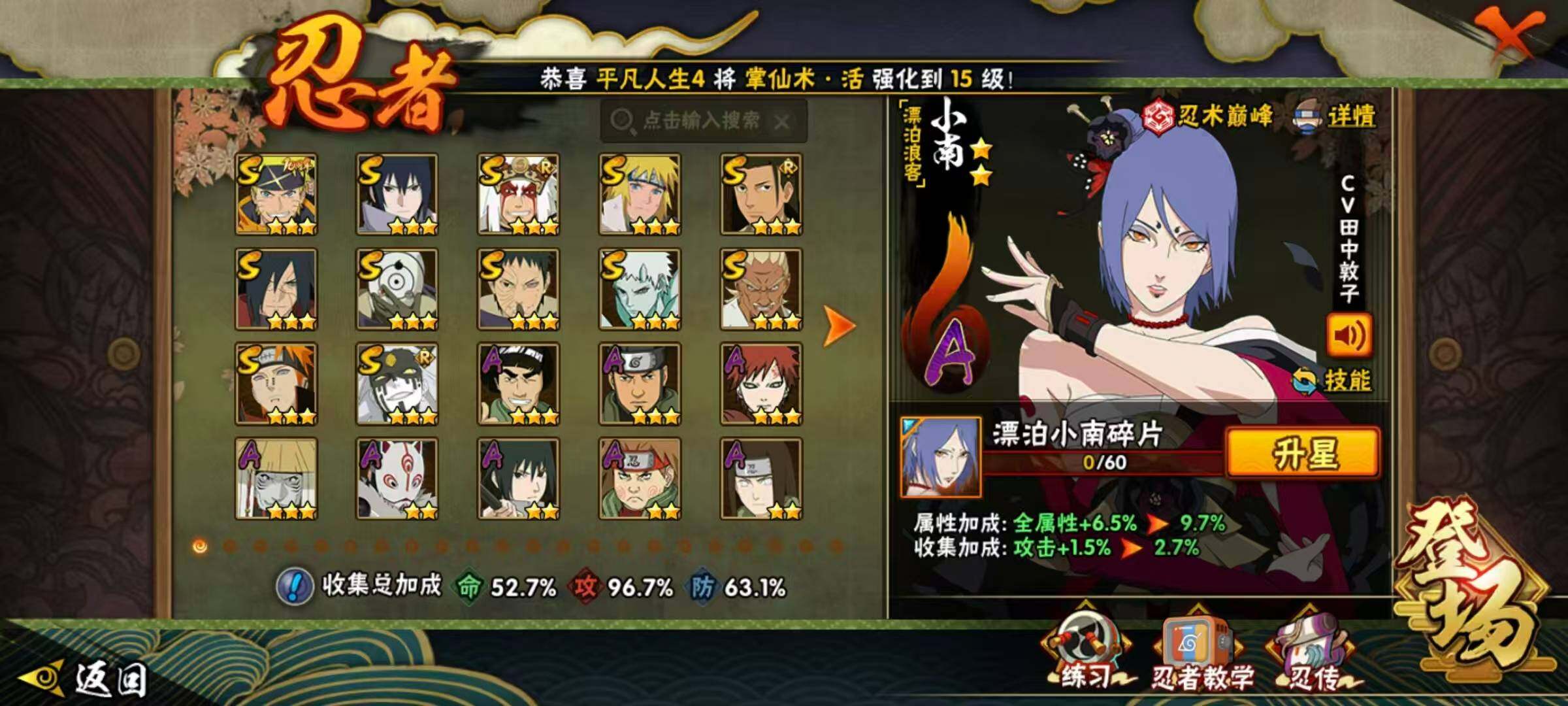 12S级忍者数-32A级忍者数【S级忍者】:宇智波斑「秽土转生·解」(3星),宇智波带土「忍界大战」(3星),艾「忍界大战」(3星),千手柱间「木叶创立」(3星),自来也「舞之豪杰」(3星),波风水门(3星),佩恩「天道」(3星),宇智波佐助「永恒万花筒」(3星),宇智波斑 「白面具」(3星宇智波斑「白面具」),大筒木桃式(3星),漩涡鸣人·宇智波佐助(3星),宇智波带土「十尾人柱力」(3星)【A级忍者】:波风水门「青年」(2星),波风水门「新春限定」(2星),迪达拉(2星),迪达拉「秽土转生」