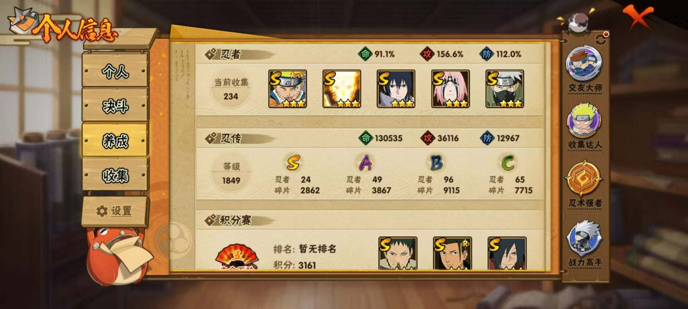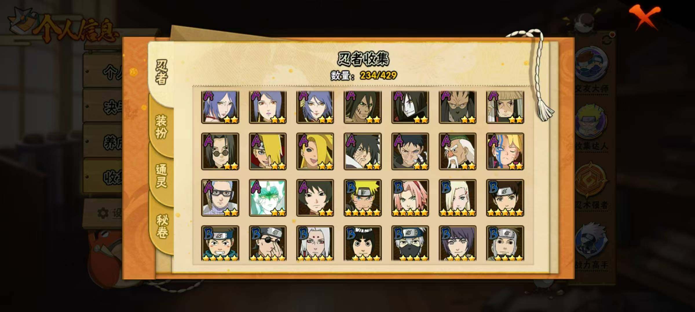 24S级忍者数-49A级忍者数【S级忍者】:波风水门「秽土转生」(3星),宇智波斑「秽土转生·解」(3星),春野樱「忍界大战」(3星),宇智波带土「忍界大战」(3星),艾「忍界大战」(3星),宇智波鼬「须佐能乎」(3星),宇智波止水「须佐能乎」(3星),旗木卡卡西「须佐能乎」(3星),千手柱间「木叶创立」(3星),无「二代目土影」(3星),自来也「舞之豪杰」(3星),大蛇丸(3星),自来也「传说中的三忍」(3星),波风水门(3星),神秘面具男「红夜之刃」(3星),漩涡鸣人「九喇嘛连结」(3星),