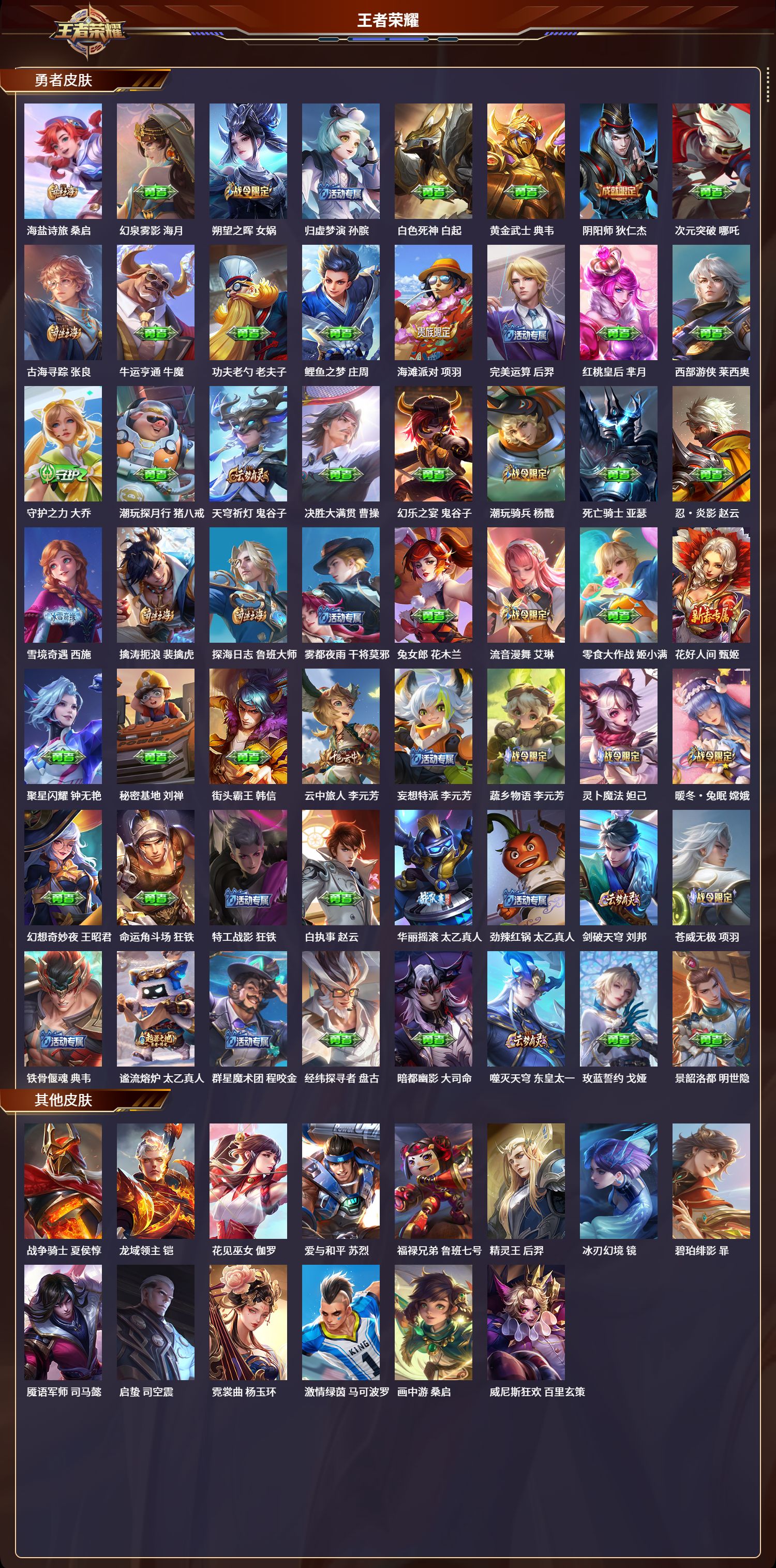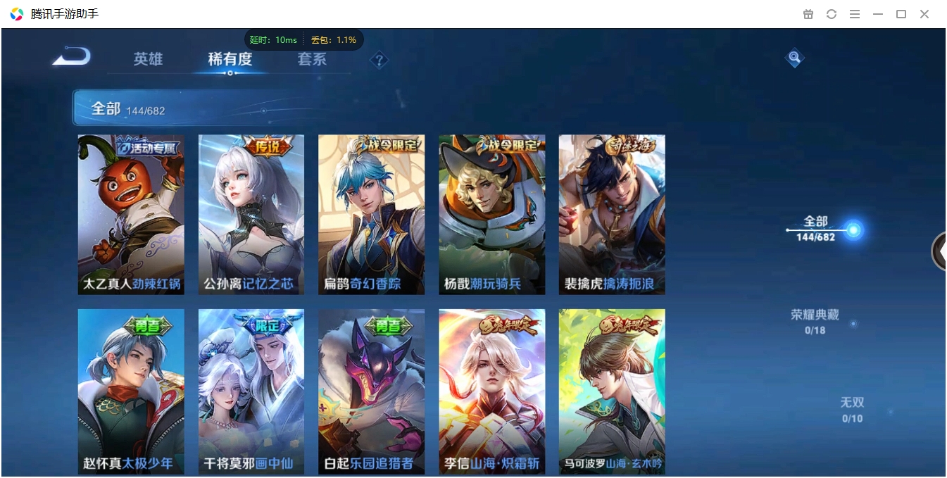 最强王者/144皮肤/117英雄/0典藏/0珍品无双/0无双/0珍品传说/13传说/50史诗/5稀有英雄幸运值244 紫星币104