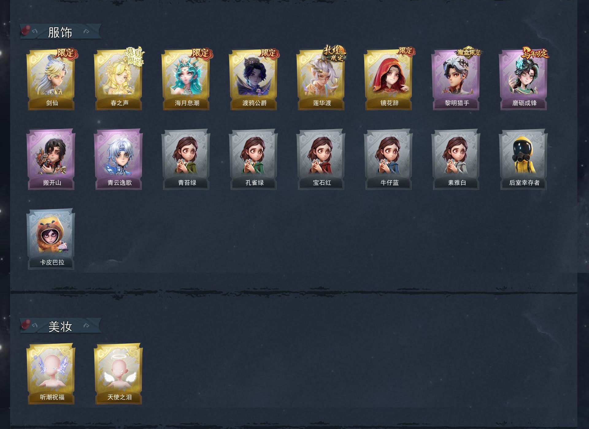 ZR547,金皮:6,紫皮:4,道具皮:30,服装:,道具皮肤:电击枪-权杖的许诺、除额仪-冰晶般的代价、急救包-末章心跳、音响-happy猫、电击枪-甜蜜泡泡枪、腰包-红运福虎、铲子-龙鳞、桃木剑-绯色遗证、荧光棒-桃心、长鞭-缚誓之锁、长枪-波塞冬、夜视仪-敛花容、葫芦-伏妖塔、葫芦-海心凝珠、额外的背包-飞花令、摸金符-紫霄、急救包-土拨鼠捏捏、夜视仪-金丝眼镜、摸金符-海洋之心、传送按钮-