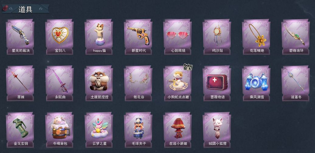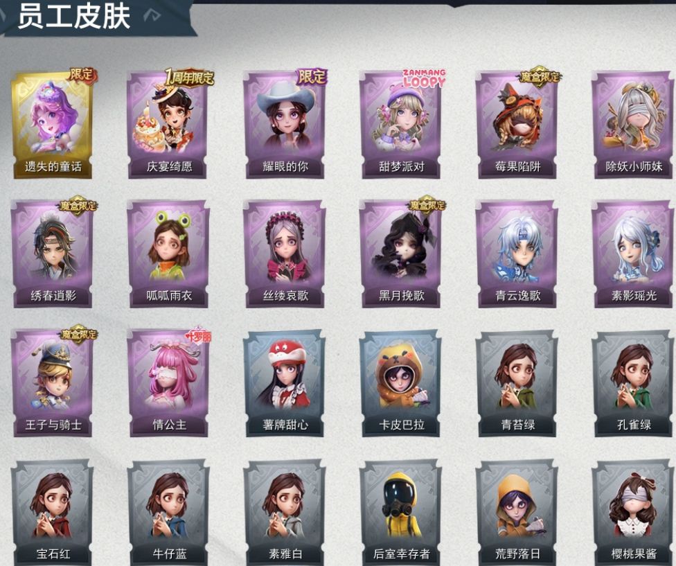 ZR764,金皮:1,紫皮:13,道具皮:22,服装:爱丽丝-薯牌甜心,零-卡皮巴拉,小黄-青苔绿,小黄-孔雀绿,小黄-宝石红,小黄-牛仔蓝,小黄-素雅白,小黄-后室幸存者,零-荒野落日,莉莉-樱桃