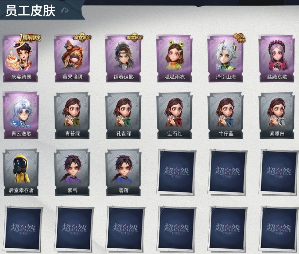 ZR770,紫皮:7,道具皮:14,道具皮肤:腰包-宝剑八、音响-happy猫、音响-鸣沙鼓、刺刀-碧络琅环、伞-沐春颂、额外的背包-飞花令、长鞭-飞天绫、急救包-土拨鼠捏捏、急救包-蔷薇物语、闪光弹-金戈玄铜、长鞭-新春炸响、背饰-牛啤背包、背饰-醉花阴,员工:小黄、爱丽丝、零、阿念、逍遥、薇薇安、巫铃儿、莉莉、艾伦、爱德华、兰、小满、临云,动作:新年摇、七仔摇、luvaboy、DL摇、舞台中心