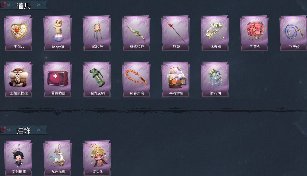 ZR770,紫皮:7,道具皮:14,道具皮肤:腰包-宝剑八、音响-happy猫、音响-鸣沙鼓、刺刀-碧络琅环、伞-沐春颂、额外的背包-飞花令、长鞭-飞天绫、