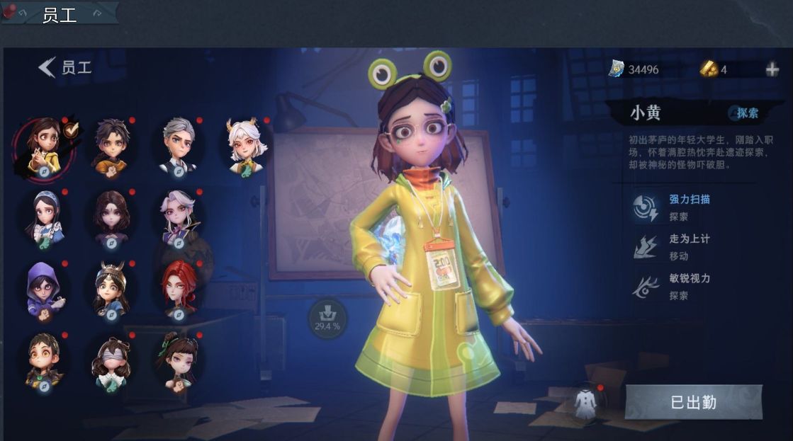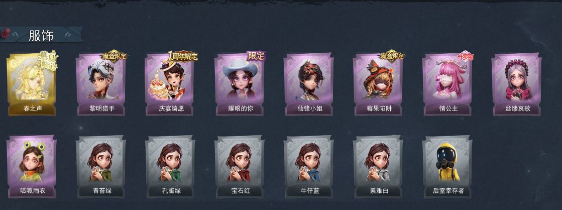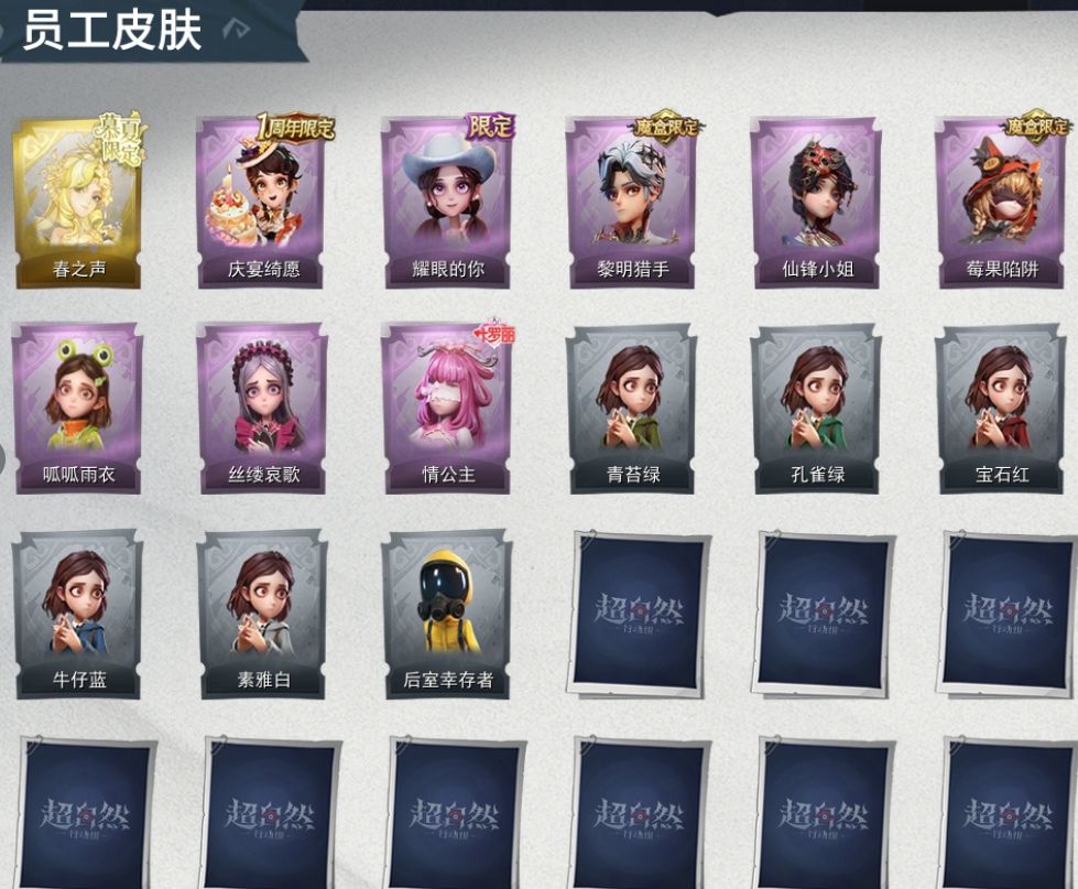 ZR771,金皮:1,紫皮:8,道具皮:16,员工:小黄、爱丽丝、零、阿念、逍遥、薇薇安、巫铃儿、莉莉、艾伦、爱德华、兰、小满、临云,服装:兰-春之声、艾伦-黎明猎手、阿念-庆宴绮愿、爱丽丝-耀眼的你、薇薇安-仙锋小姐、莉莉-莓果陷阱、莉莉-情公主、爱丽丝-丝缕哀歌、小黄-呱呱雨衣、小黄-青苔绿、小黄-孔雀绿、小黄-宝石红、小黄-牛仔蓝、小黄-素雅白、小黄-后室幸存者,道具皮肤:摸金符-紫霄、夜视