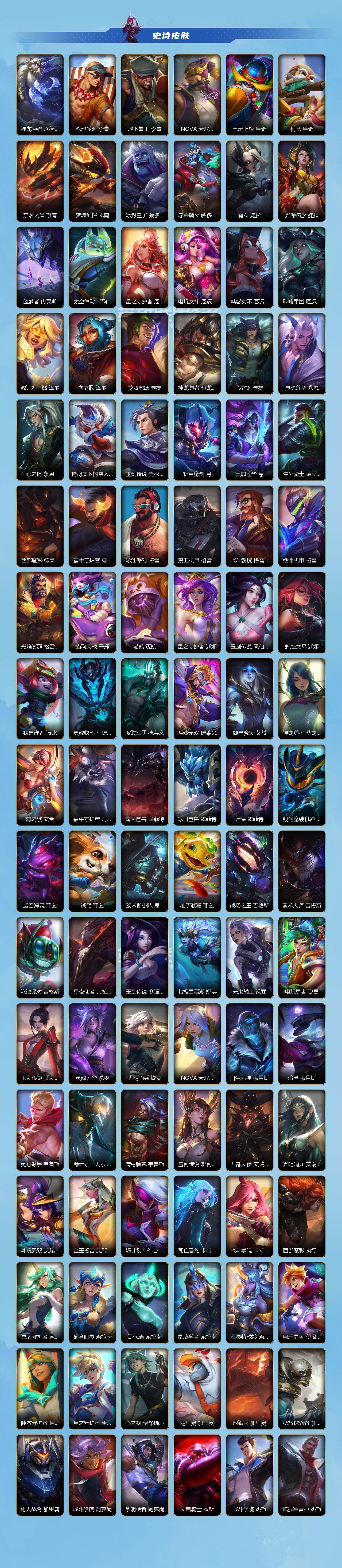 132英雄/577皮肤/流光翡翠/寻道世尊 永恩/超武乾坤:孤拳 瑟提/冠星耀辰 盖伦/夜星流火 金克丝/至臻 星之守护者 辛德拉/银鞍玉甲 嘉文四世/此志凌云 嘉文四世/龙的传人 李青/天命豪赌 瑟提/至臻 心之钢 永恩/至臻 玉剑传说 武剑仙 锐雯/满弓镇魂 箭无虚发 韦鲁斯/战斗学院 白金学长 伊泽瑞尔/蝶恋春 凯特琳/最终BOSS 里·大魔王 维迦/地底世界 崔斯特/广寒仙子 嫦娥 黛