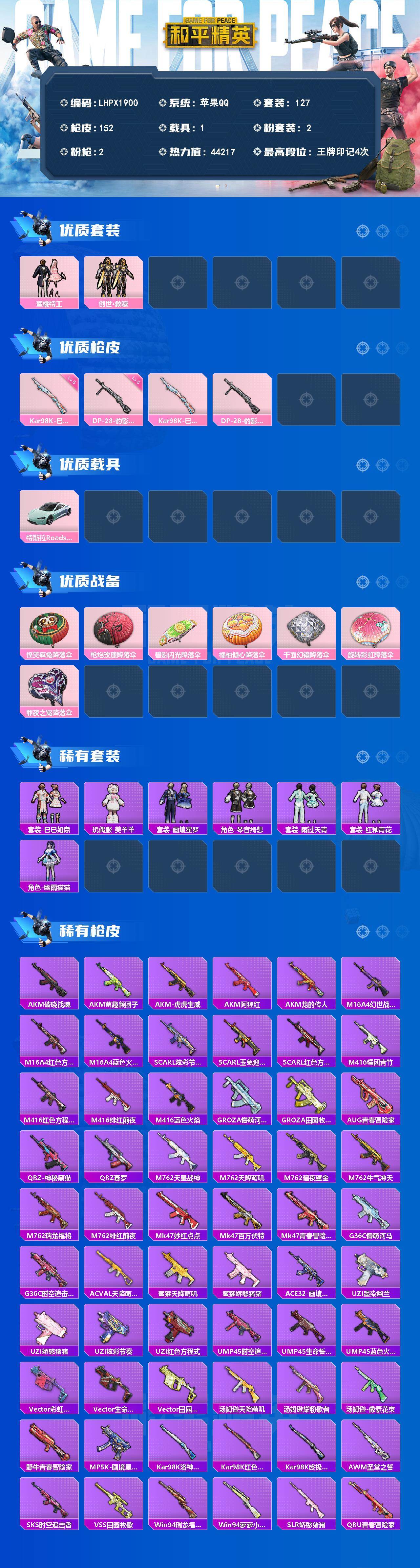 【特价出售/店主推荐】苹果 手Q-2粉装-2特效枪-1载具-44217热力值-4王牌印记-127套装-152枪皮【粉色套装】:粉装-蜜桃特工,套装-创世·救赎【粉色枪皮等级】:Kar98K-巳巳如意(五级),DP-28-豹影疾电(五级)【粉色载具】:特斯拉Roadster(水滴蓝)