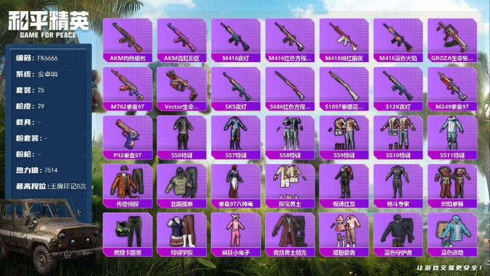 级52-法斗尖椒面罩-雪山精英-素材号】安卓 手Q-0粉装-0特效枪-0载具-0粉色飞行器-7514热力值-1王牌印记-25套装-29枪皮 【稀有枪皮】:AKM-灼热熔岩,AKM-霓虹街区,M416-夜灯,M416-红色方程式,M416-绯红前夜,M416-蓝色火焰,GROZA-生命誓言,M762-拳皇97,Vector-生命誓言,SKS-夜灯,S686-红色方程式,S1897