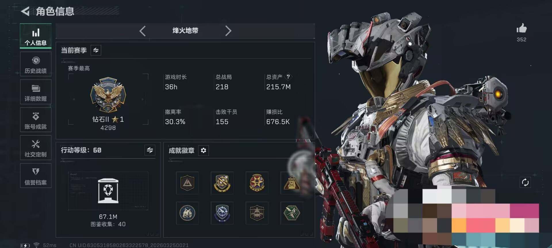 215m总资产-27957k哈夫币-60烽火等级-钻石-32战场等级-军士长