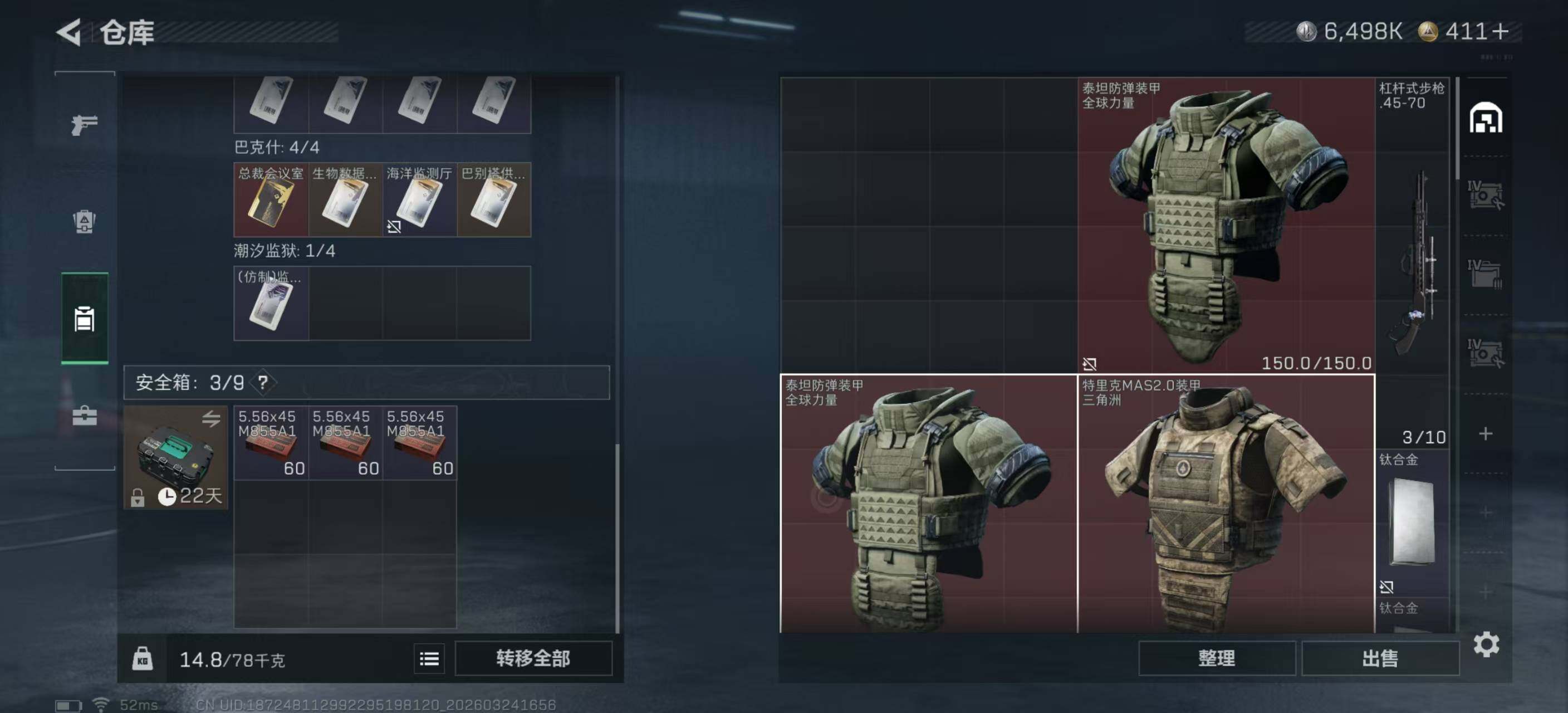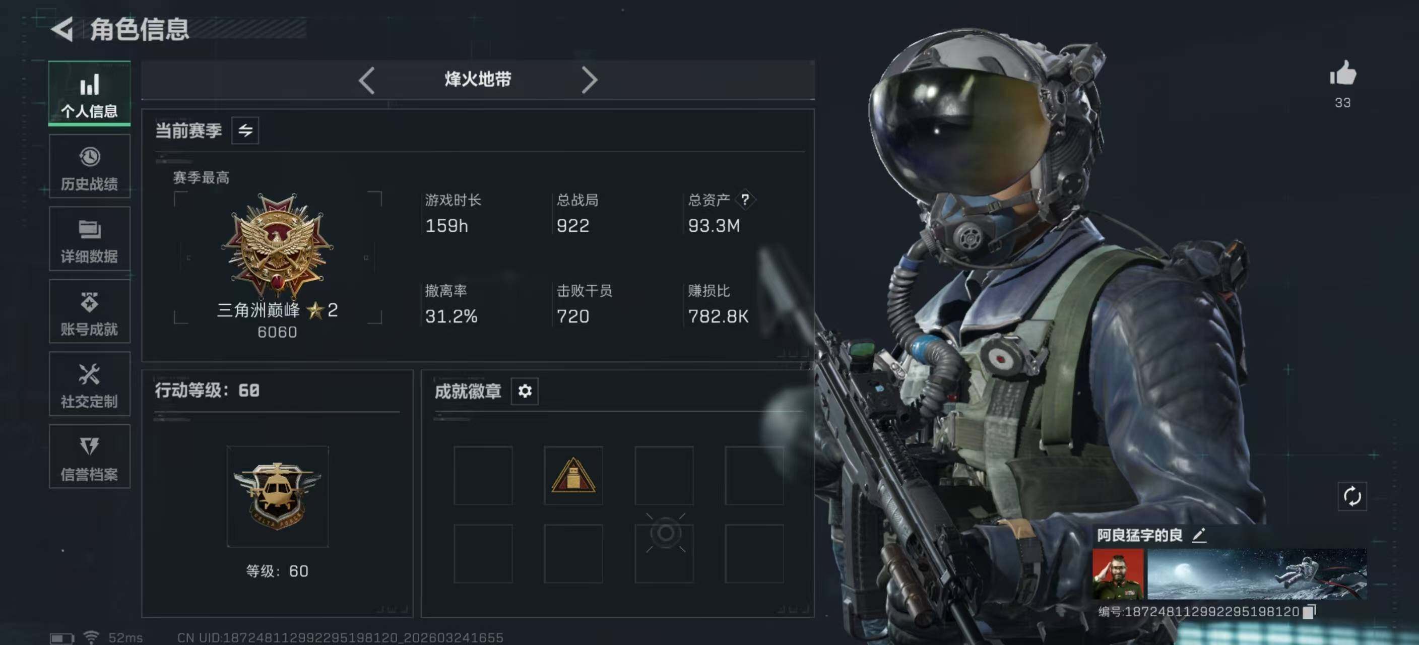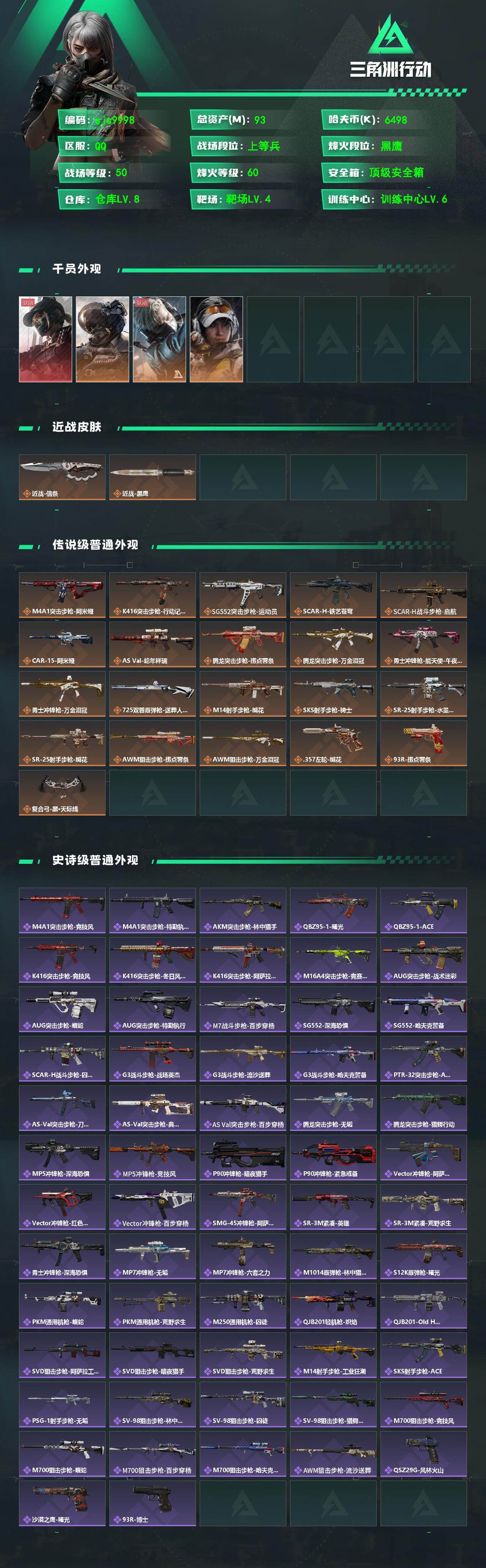93m总资产-6498k哈夫币-60烽火等级-黑鹰-50战场等级-上等兵