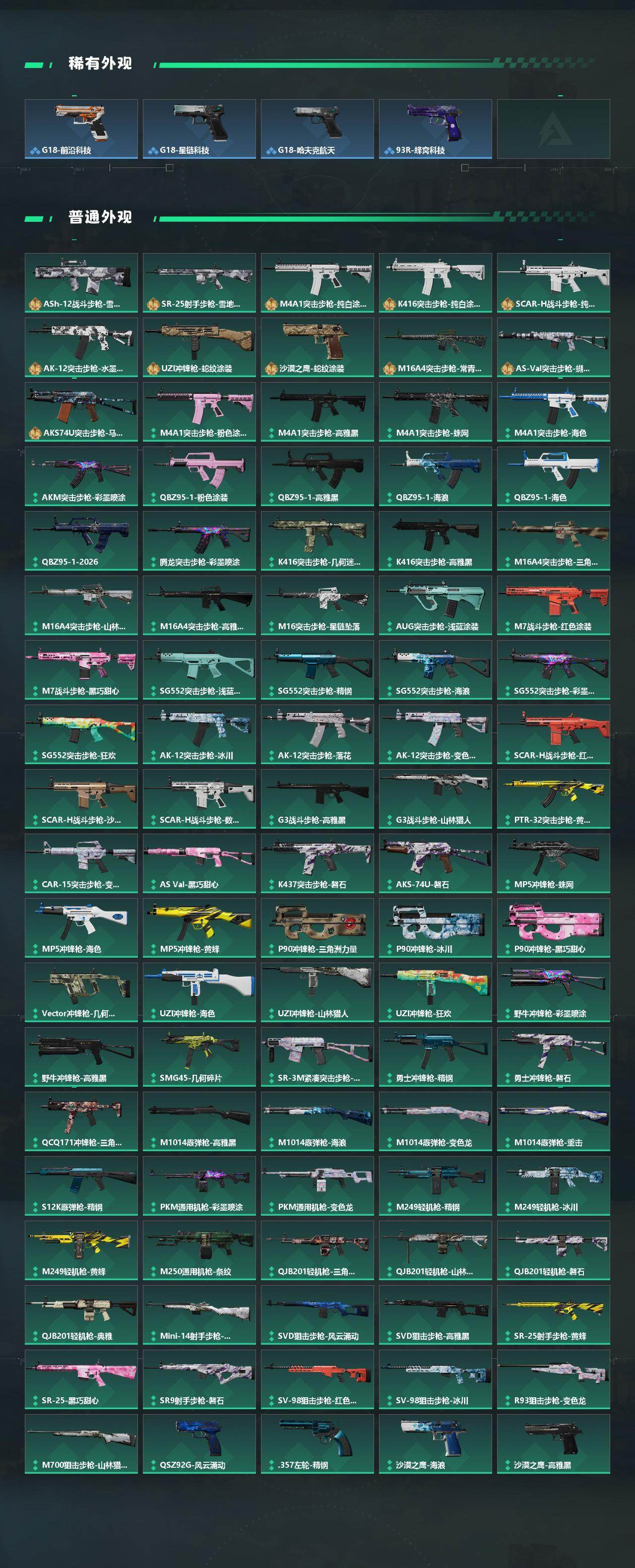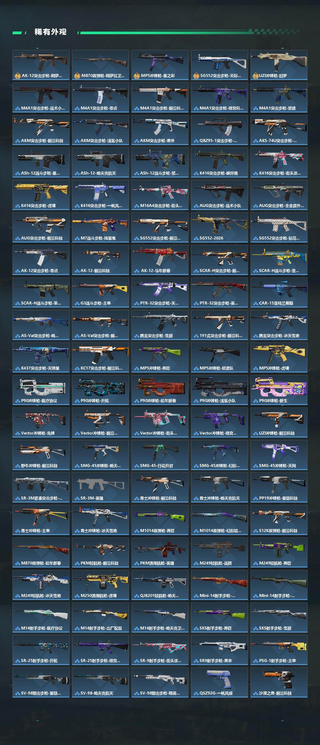 【传说外观】:M4A1突击步枪-阿米娅,K416突击步枪-行动记录,SG552突击步枪-运动员,SCAR-H战斗步枪-铁艺苍穹,SCAR-H战斗步枪-启航,CAR-15突击步枪-阿米娅,AS Val突击步枪-蛇年祥瑞,腾龙突