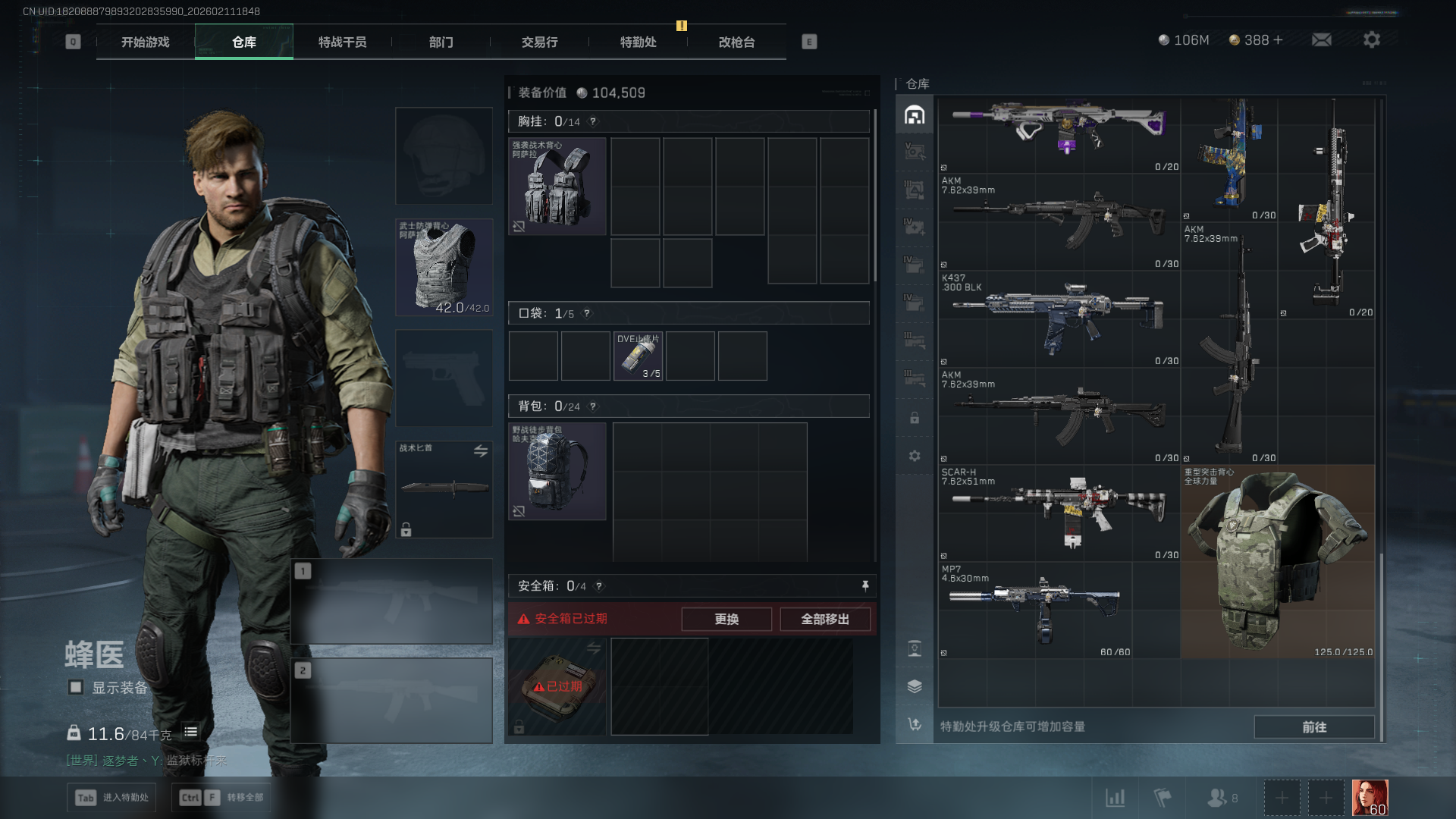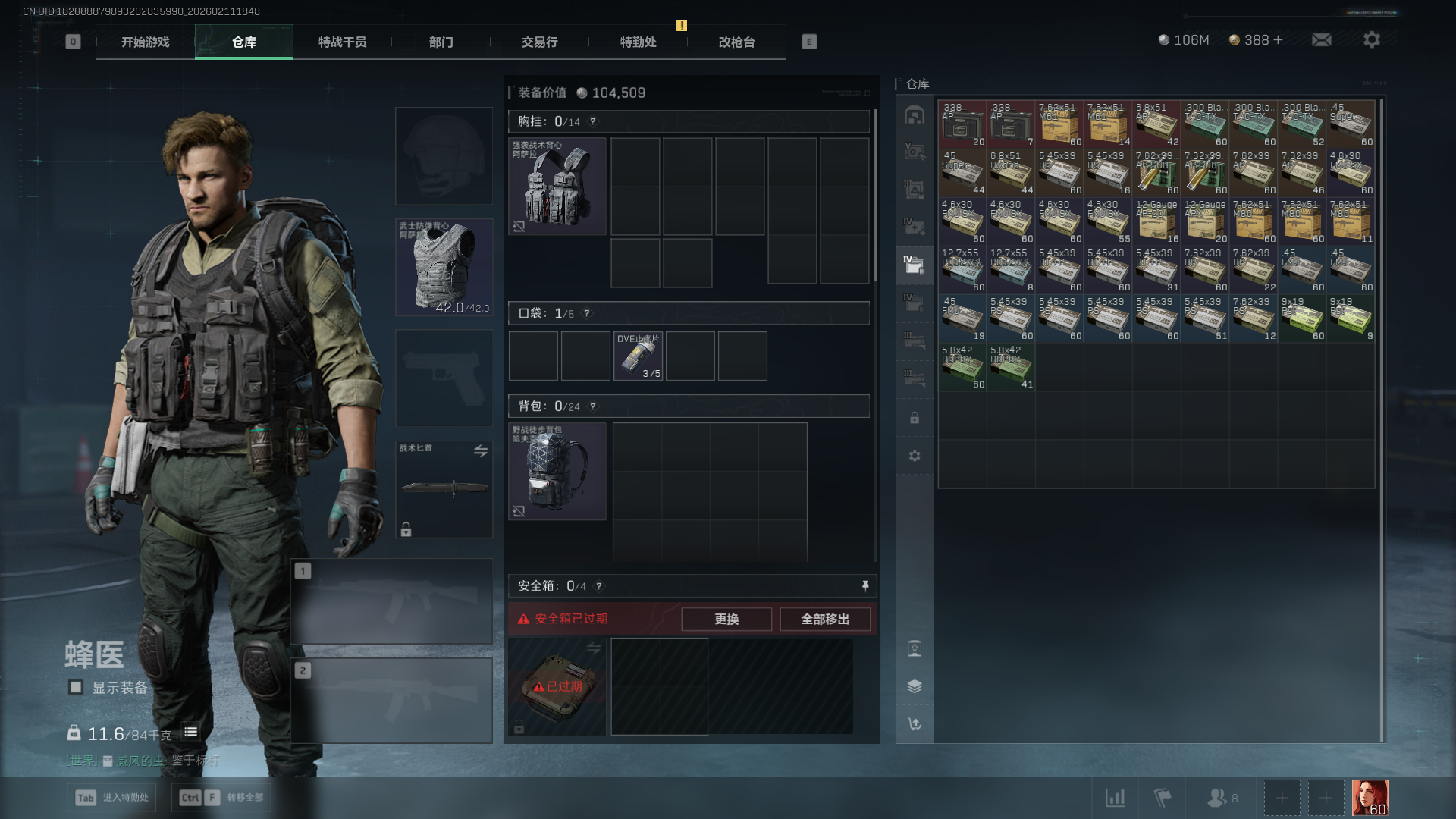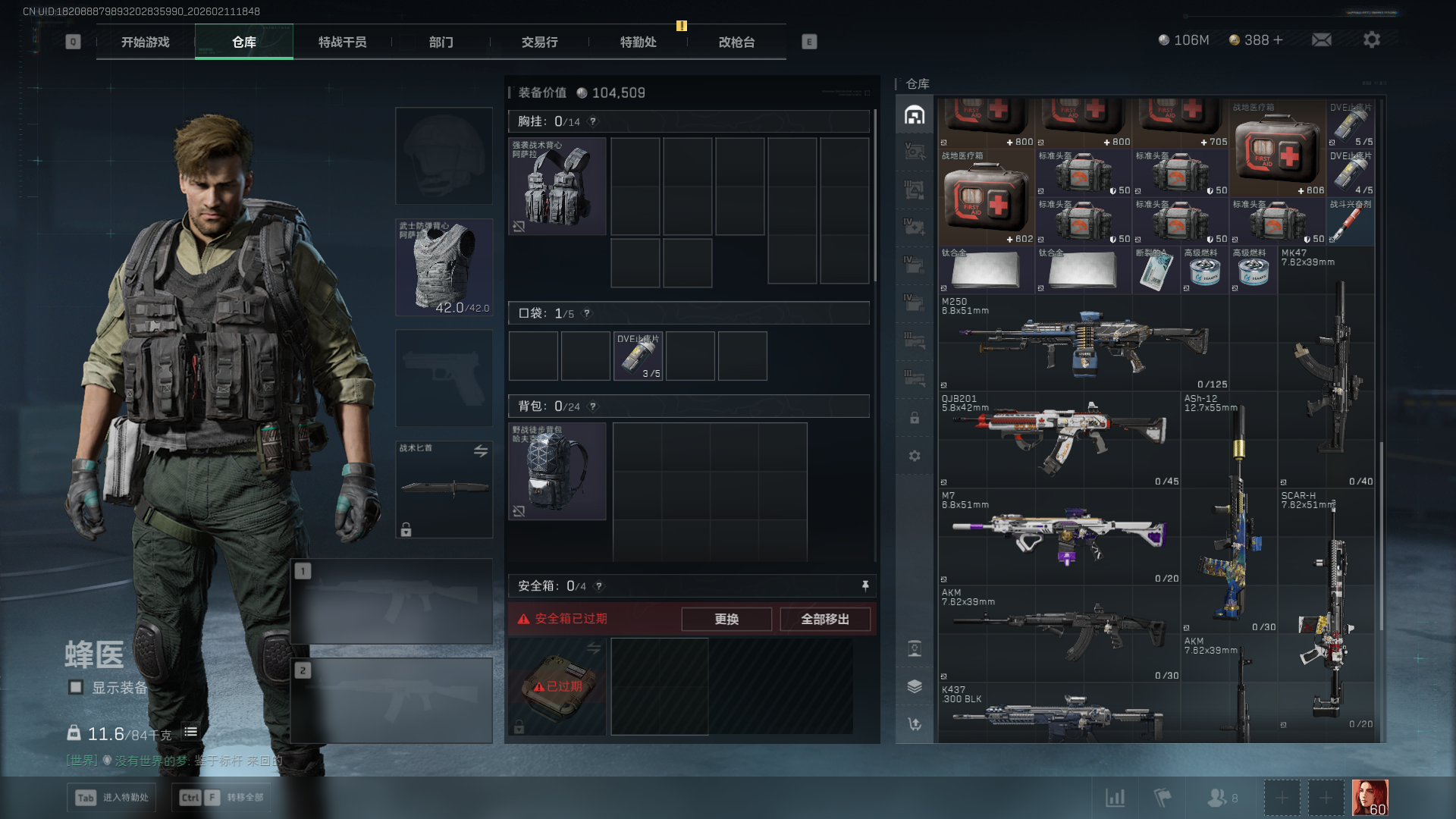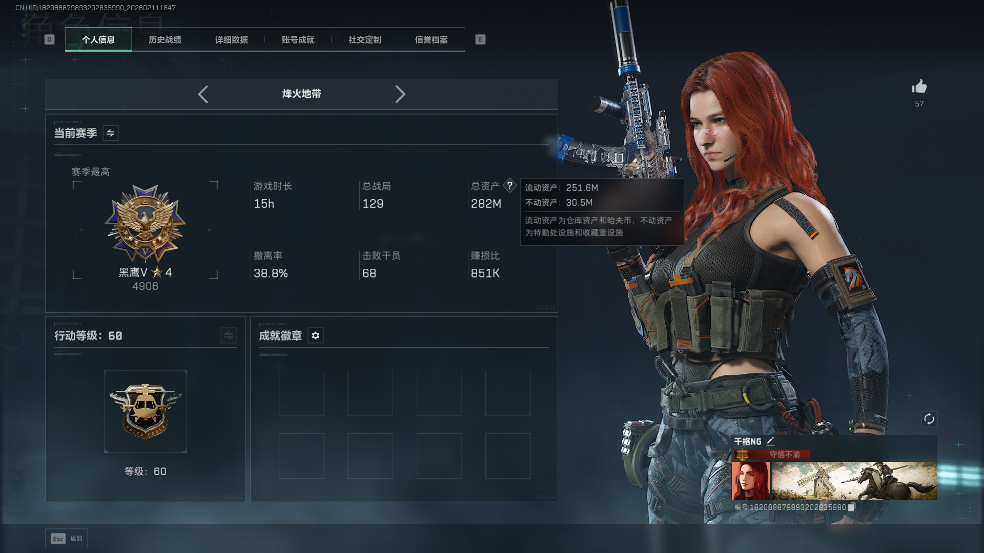 总资产:282M,哈夫币:10600W,三角币&卷合计:388,武器皮肤:12