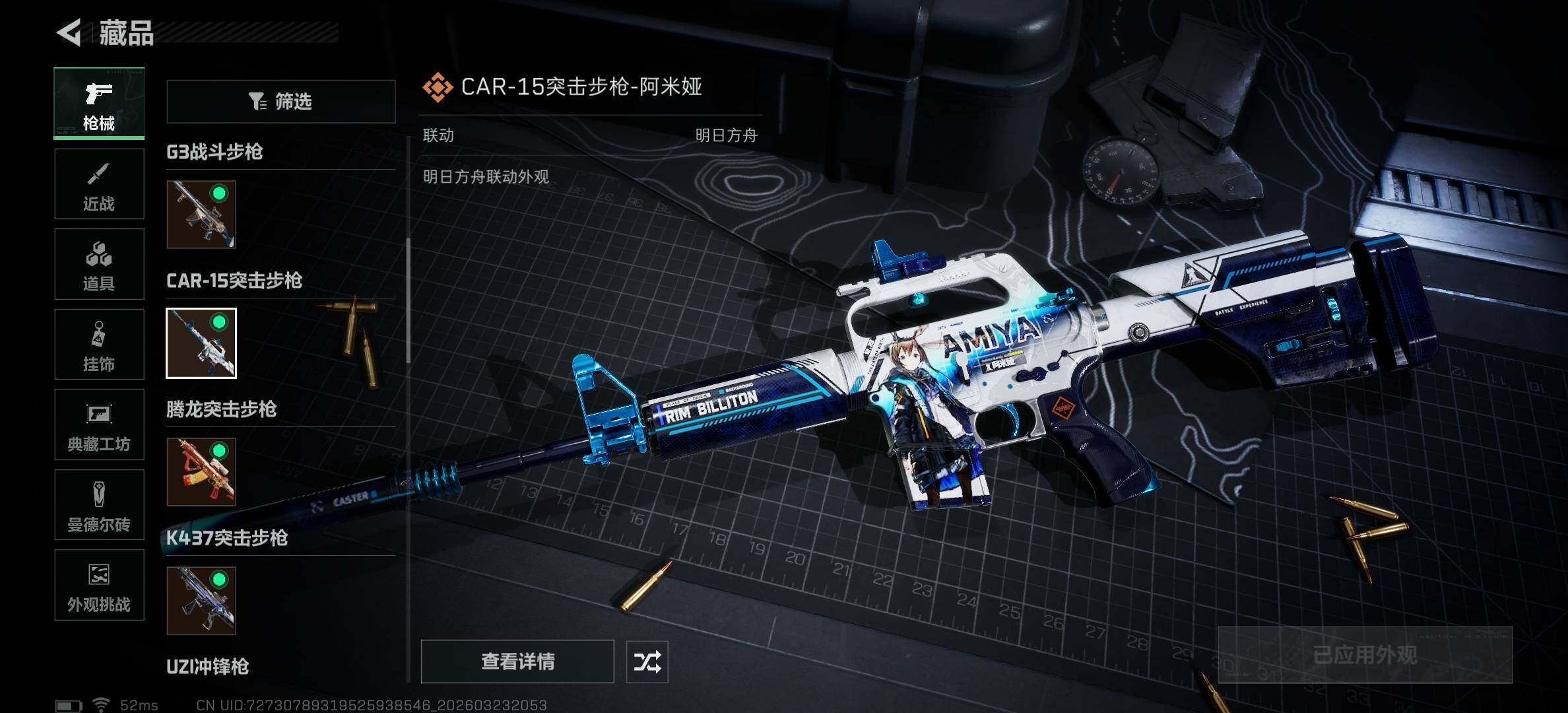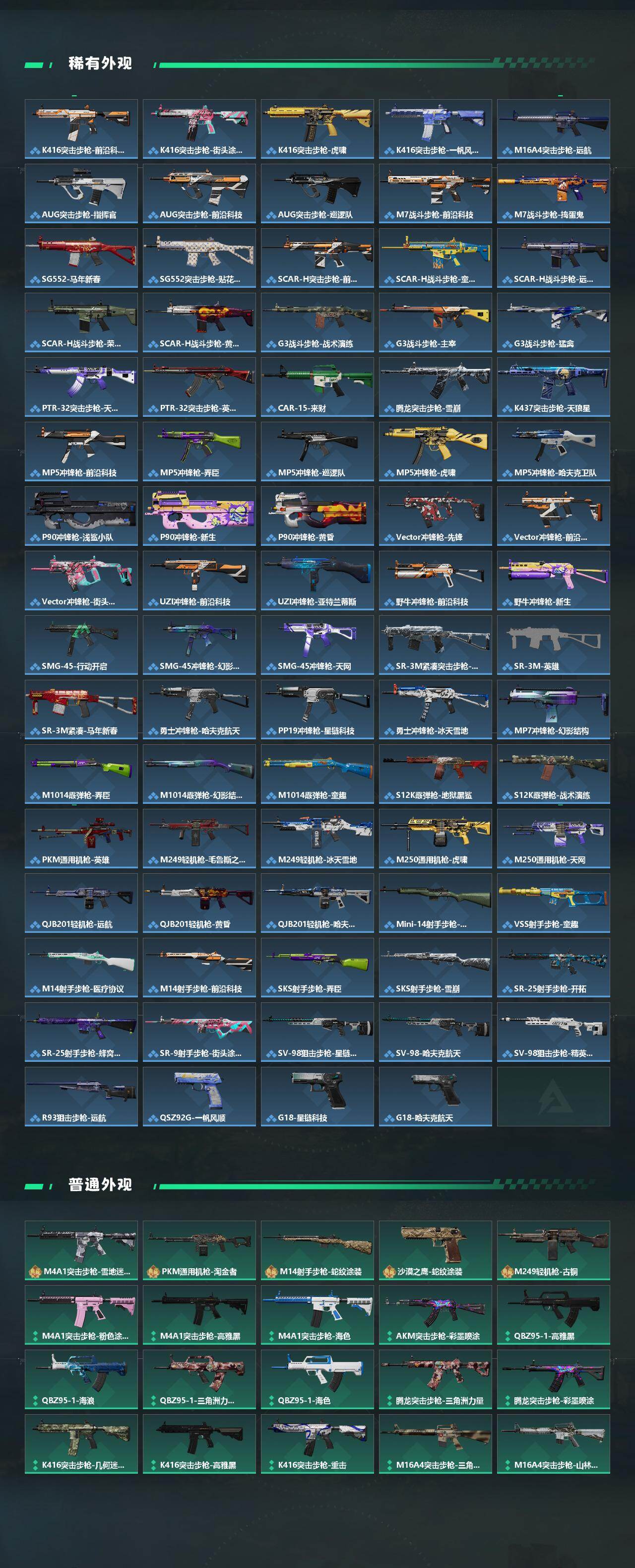 【传说外观】:M4A1突击步枪-蚀金玫瑰,M4A1突击步枪-阿米娅,QBZ95-1突击步枪-腾驹驰春,AK-12突击步枪-夜鹰,AK-12突击步枪-特斯拉线圈,S
