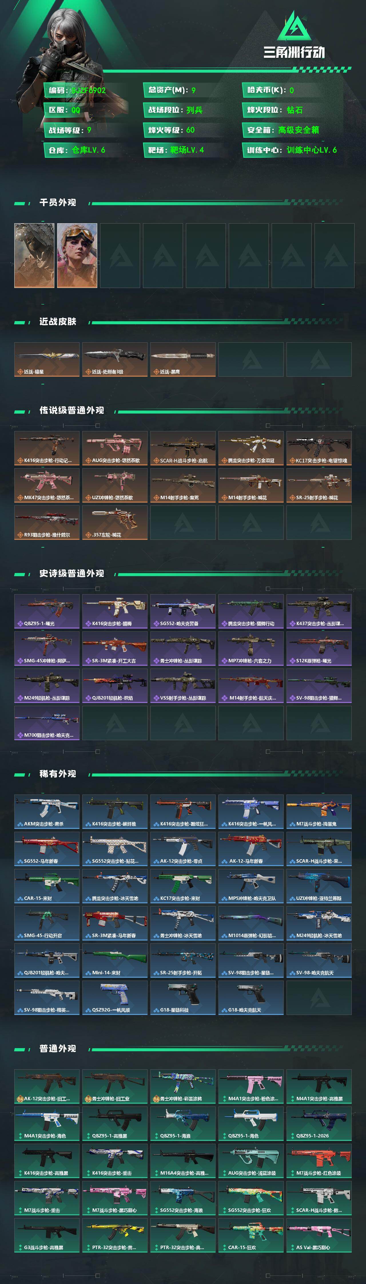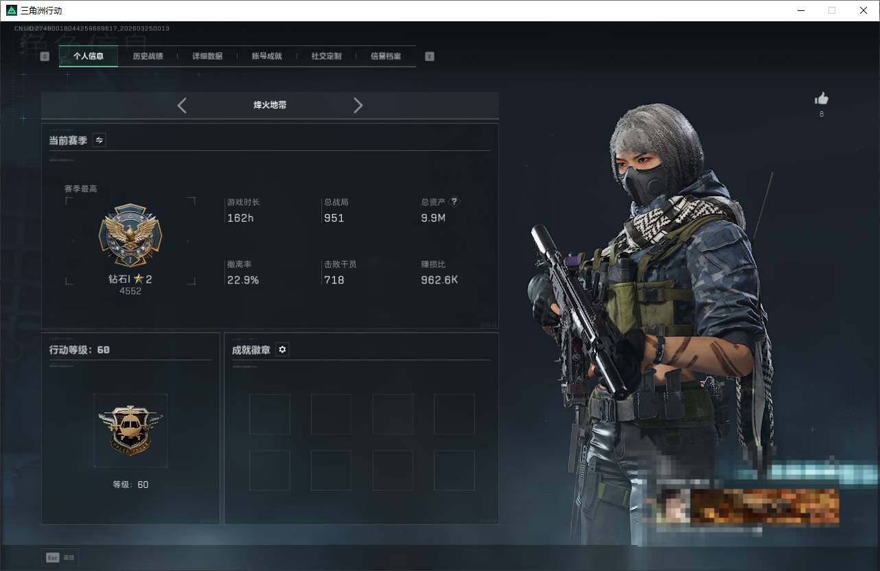 9m总资产-0k哈夫币-60烽火等级-钻石-9战场等级-列兵