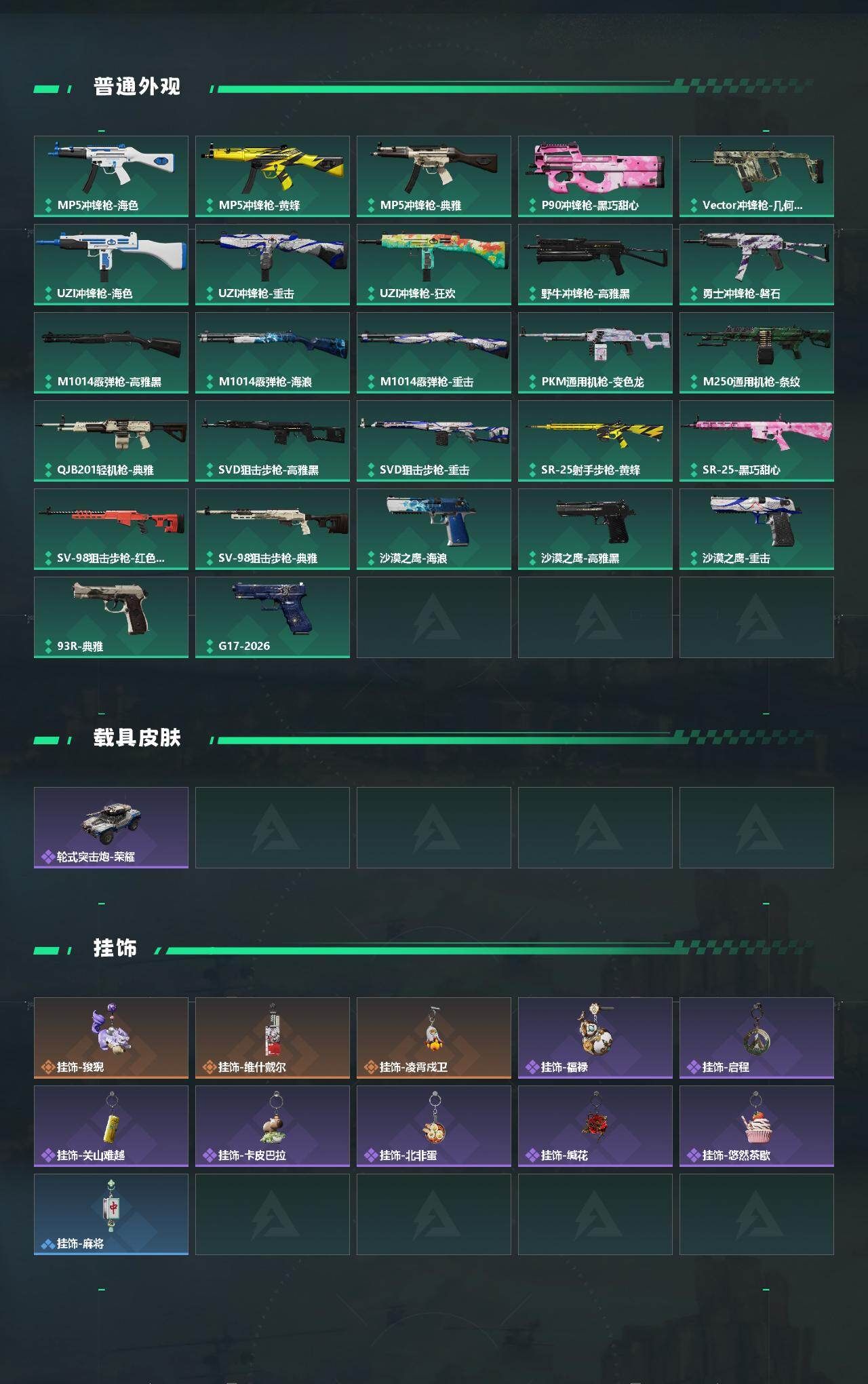 【传说外观】:K416突击步枪-行动记录,AUG突击步枪-悠然茶歇,SCAR-H战斗步枪-启航,腾龙突击步枪-万金泪冠,KC17突击步枪-电锯惊魂,MK47突击步枪-悠然茶歇,UZI冲锋枪-悠然茶歇,M14射手步枪-蛮荒,M14射手步枪-缄花,SR-25射手步枪-缄花,R93狙击步枪-维什戴尔,.357左轮-缄花